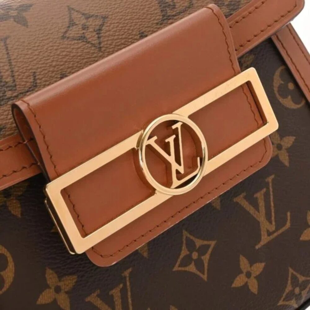 Casual Louis Vuitton Dauphine handbag in brown cotton with leather trim and signature LV clasp. A luxury shoulder bag perfect for everyday style and comfort.