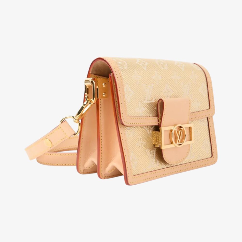 Elegant Louis Vuitton Dauphine handbag in gold cloth with leather trim and signature LV clasp. A luxury shoulder bag perfect for everyday sophistication.