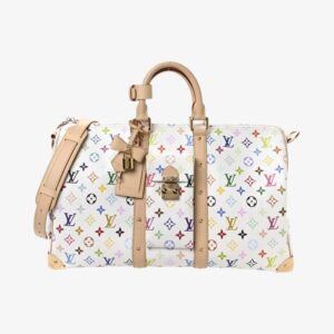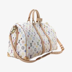 Louis Vuitton Keepall Bandoulière 45 in LV x TM Monogram Multicolor canvas with white leather trim. A stylish and spacious luxury travel bag for everyday adventures.