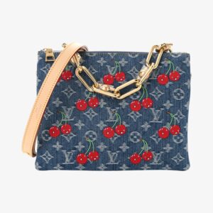 Louis Vuitton Coussin PM in LV x TM Monogram denim with playful cerises accents and refined padded design. A chic luxury handbag perfect for everyday elegance.