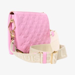 Louis Vuitton Coussin PM in rose bonbon lambskin with embossed Monogram and plush padded design. A chic luxury handbag perfect for everyday elegance.