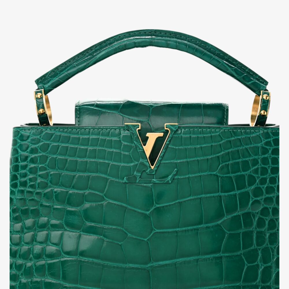 Ultra-luxury Louis Vuitton Capucines BB in emerald alligator leather with refined hardware. A premium handbag perfect for elegant occasions and collectible style.