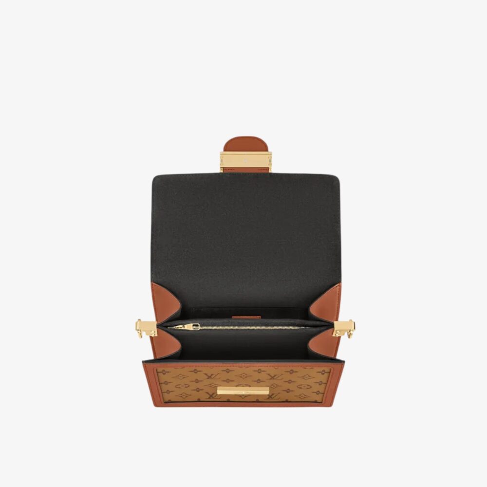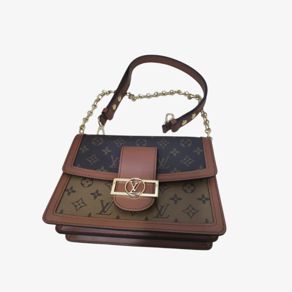 Sophisticated Louis Vuitton Dauphine handbag in brown cloth with leather trim and iconic LV clasp. A luxury shoulder bag perfect for everyday elegance.