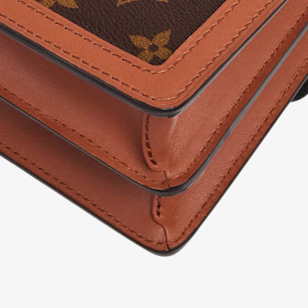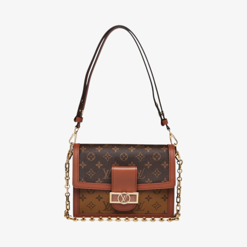 Sophisticated Louis Vuitton Dauphine handbag in brown cloth with leather trim and iconic LV clasp. A luxury shoulder bag perfect for everyday elegance.