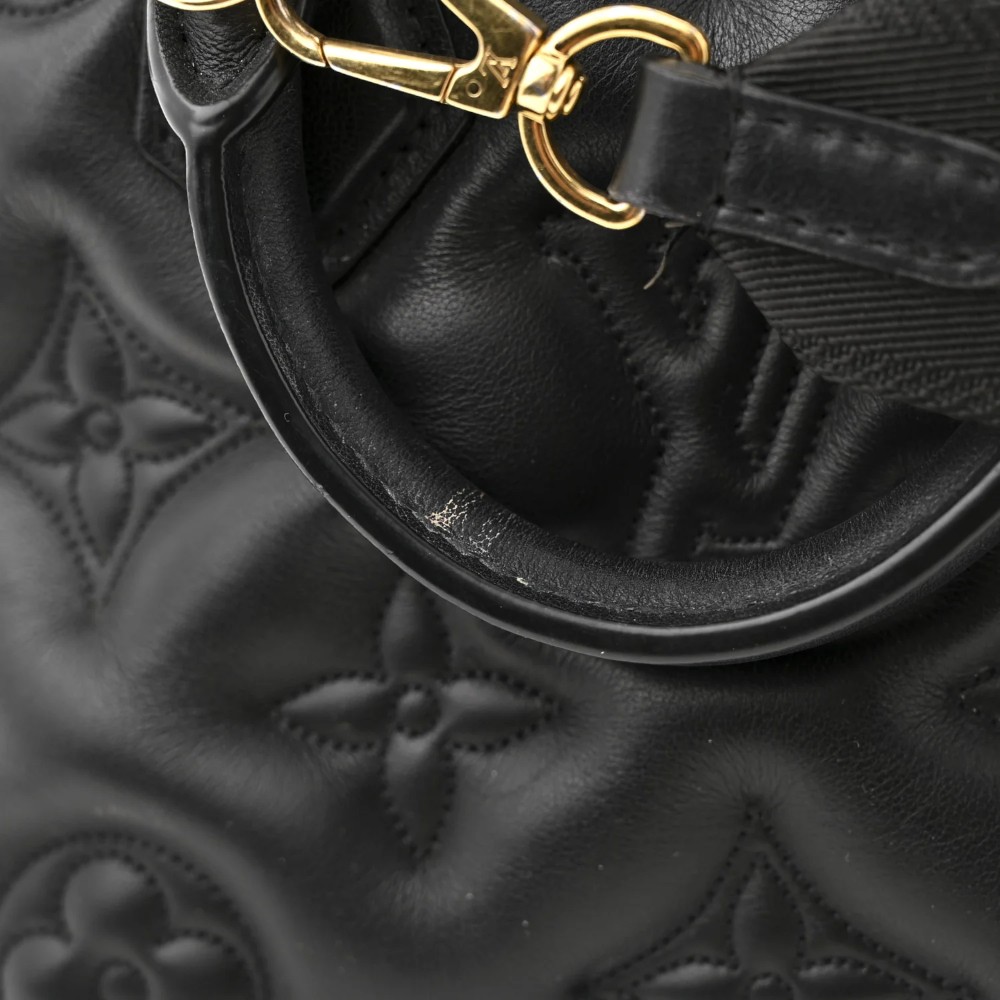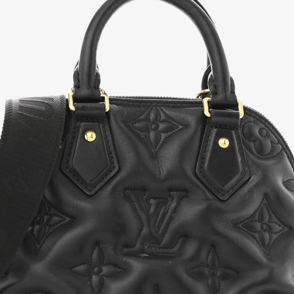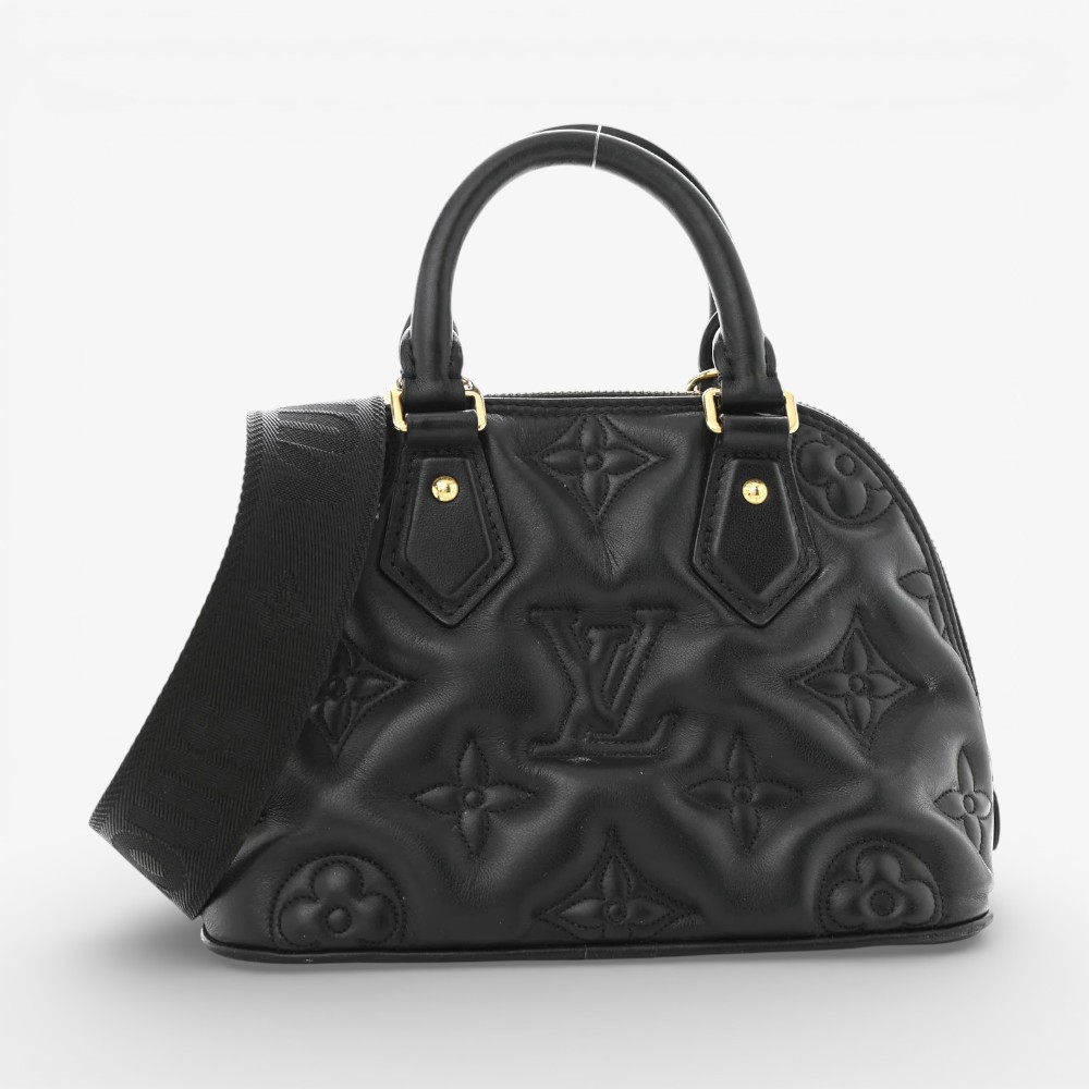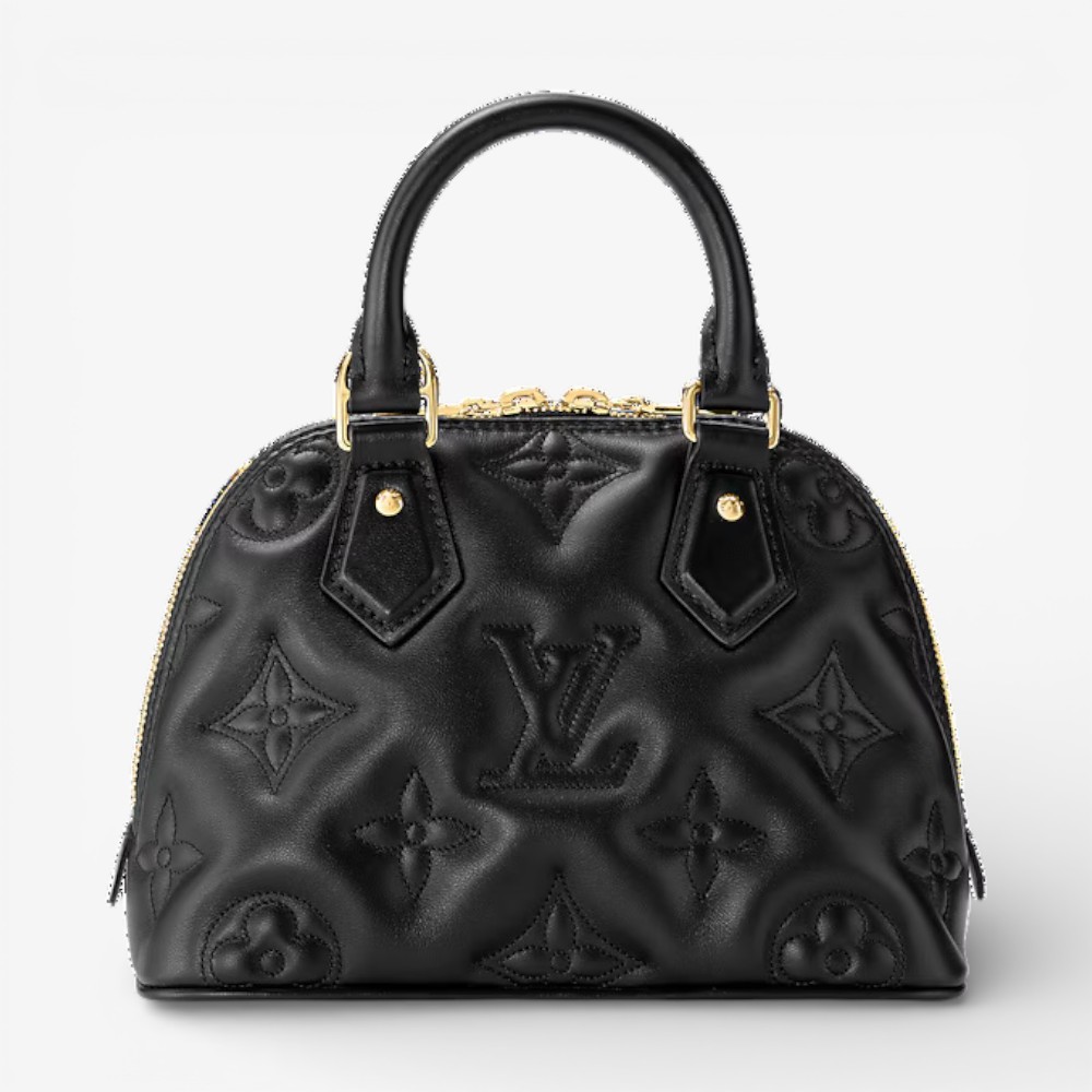 Louis Vuitton Alma BB in black calfskin with Bubblegram quilted texture and refined hardware. A chic luxury mini handbag perfect for everyday elegance.
