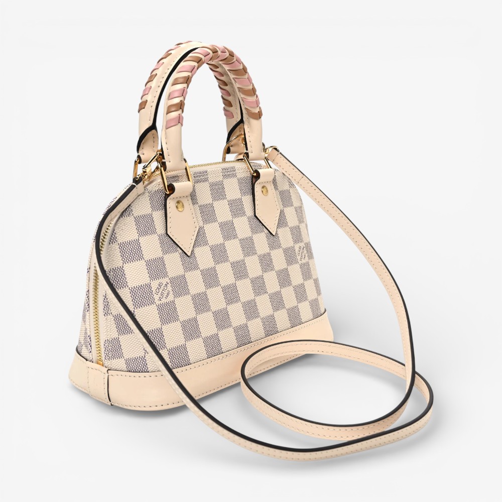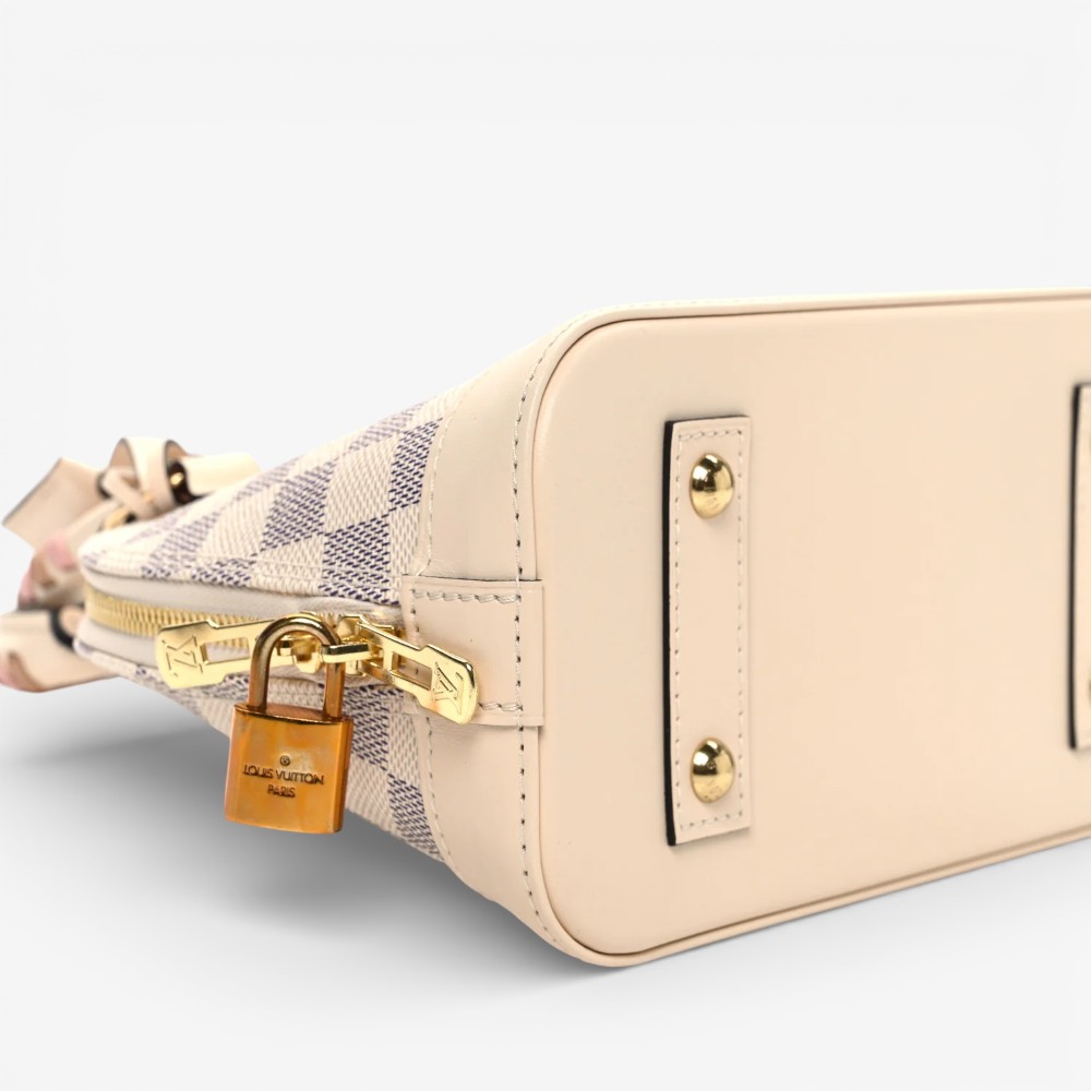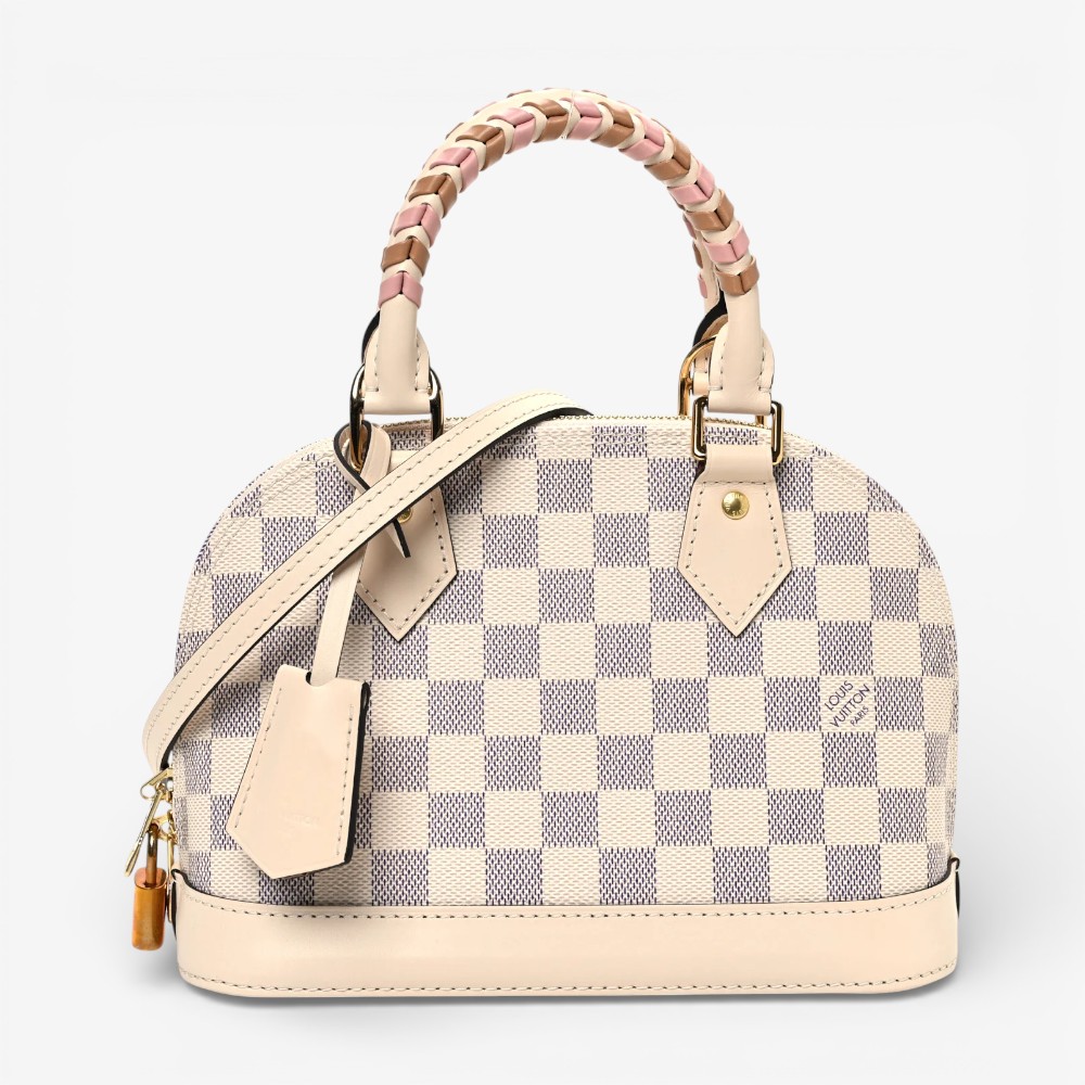 Louis Vuitton Alma BB in Damier Azur canvas with braided leather handles and refined trim. A chic luxury handbag perfect for everyday sophistication.