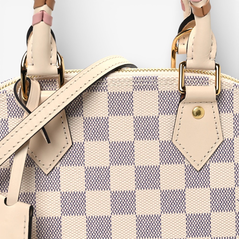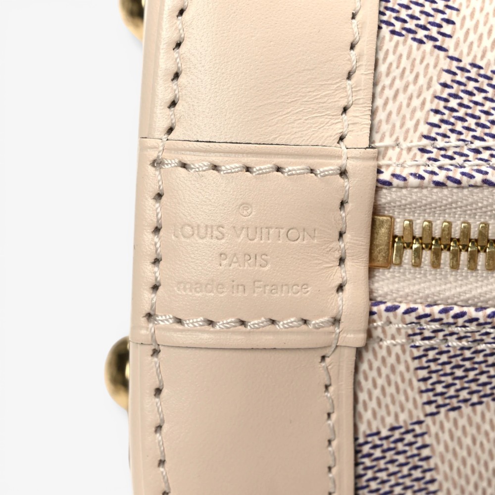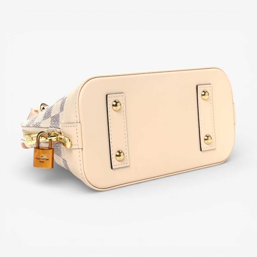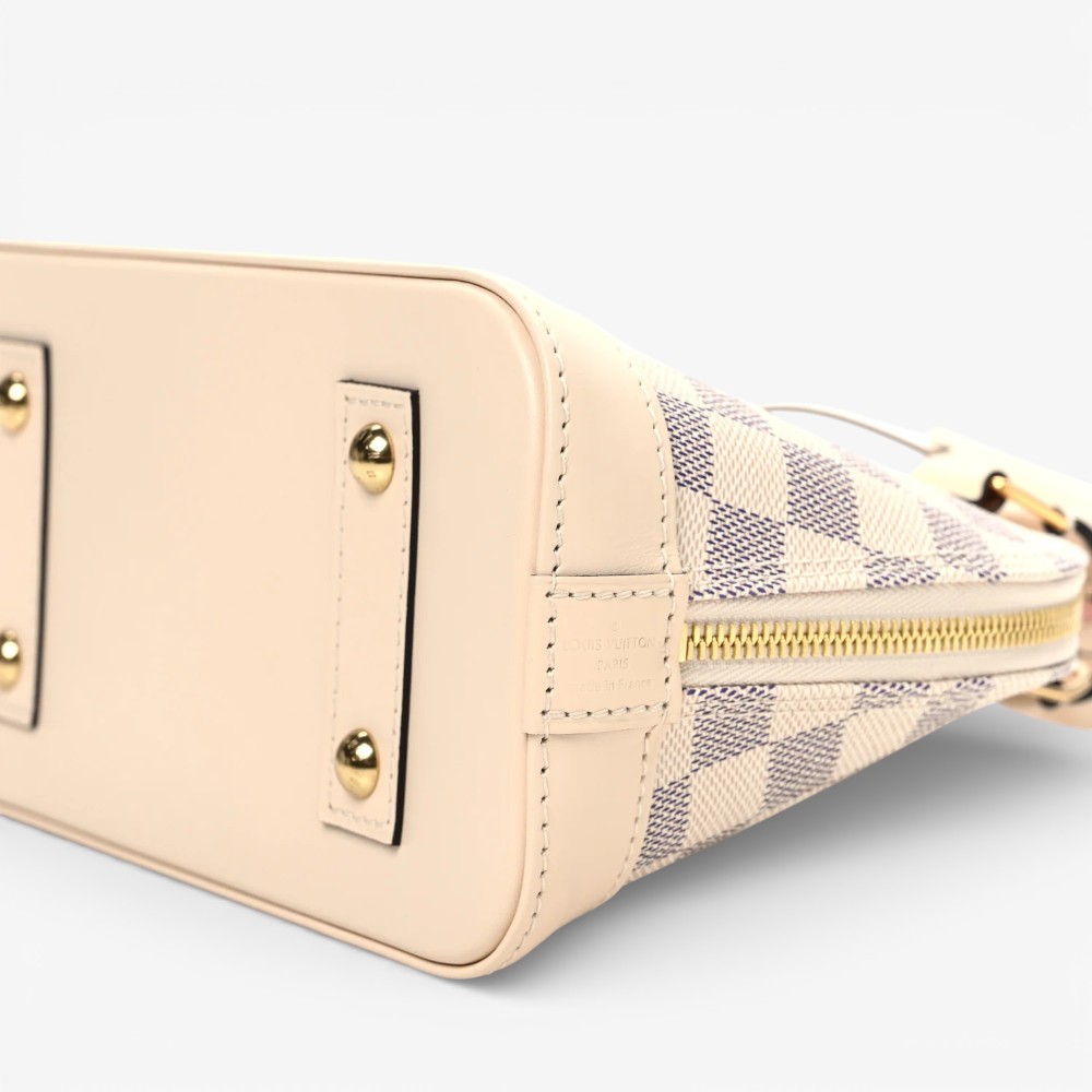 Louis Vuitton Alma BB in Damier Azur canvas with braided leather handles and refined trim. A chic luxury handbag perfect for everyday sophistication.
