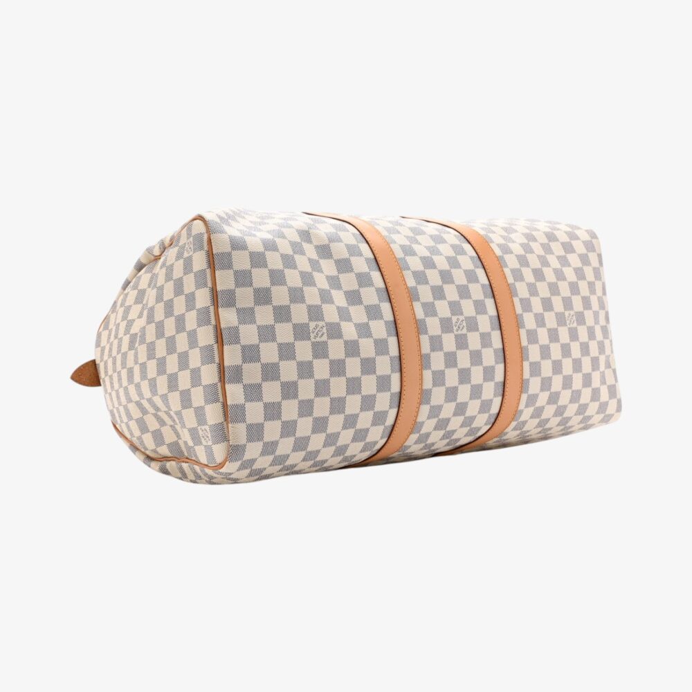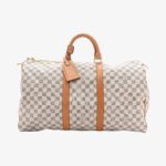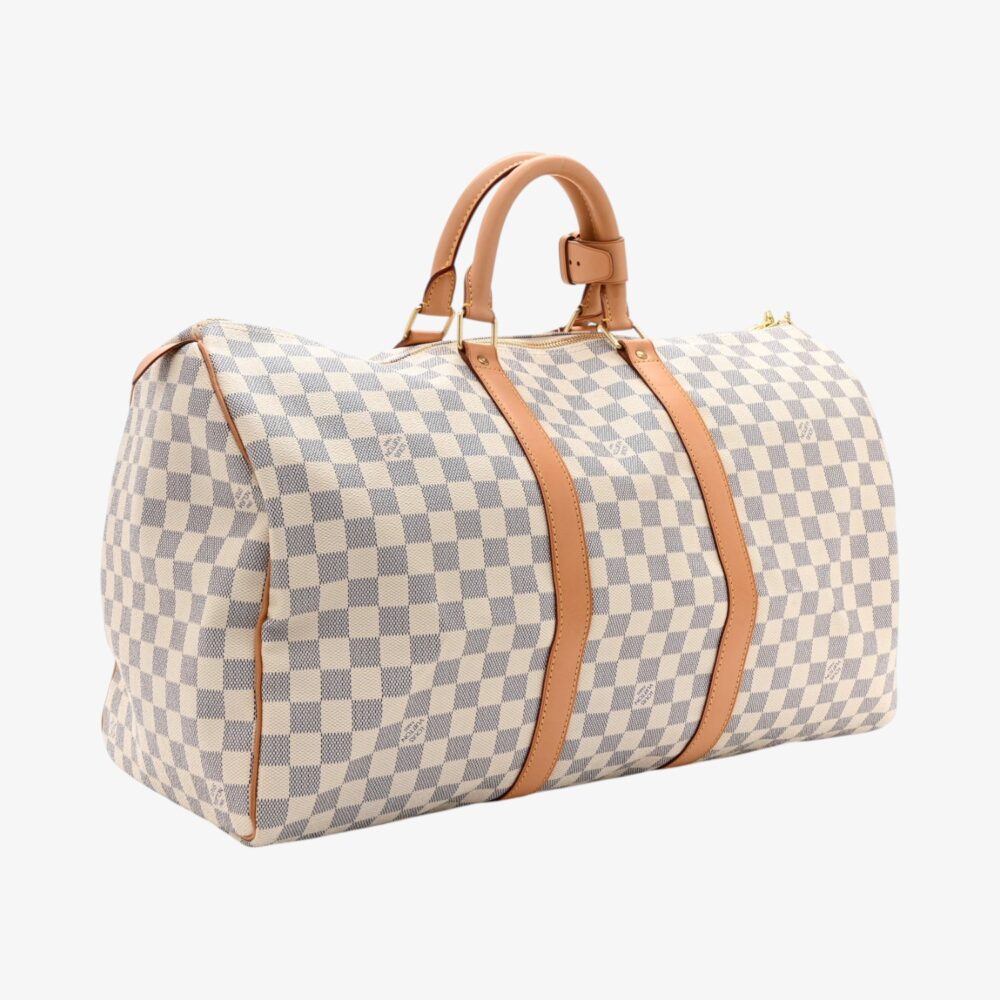 Classic Louis Vuitton Keepall 50 in Damier Azur canvas with soft neutral tones. A luxury travel bag perfect for daily adventures and weekend getaways.