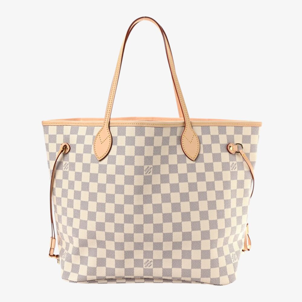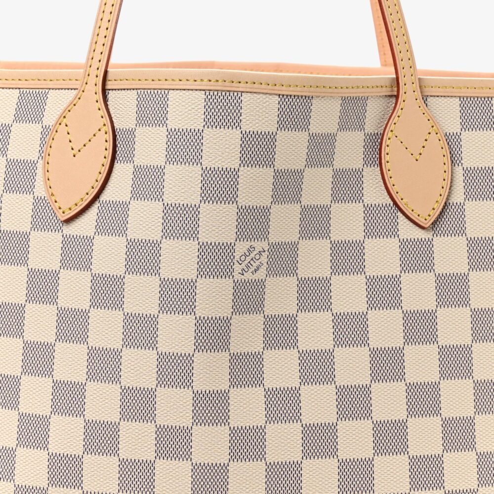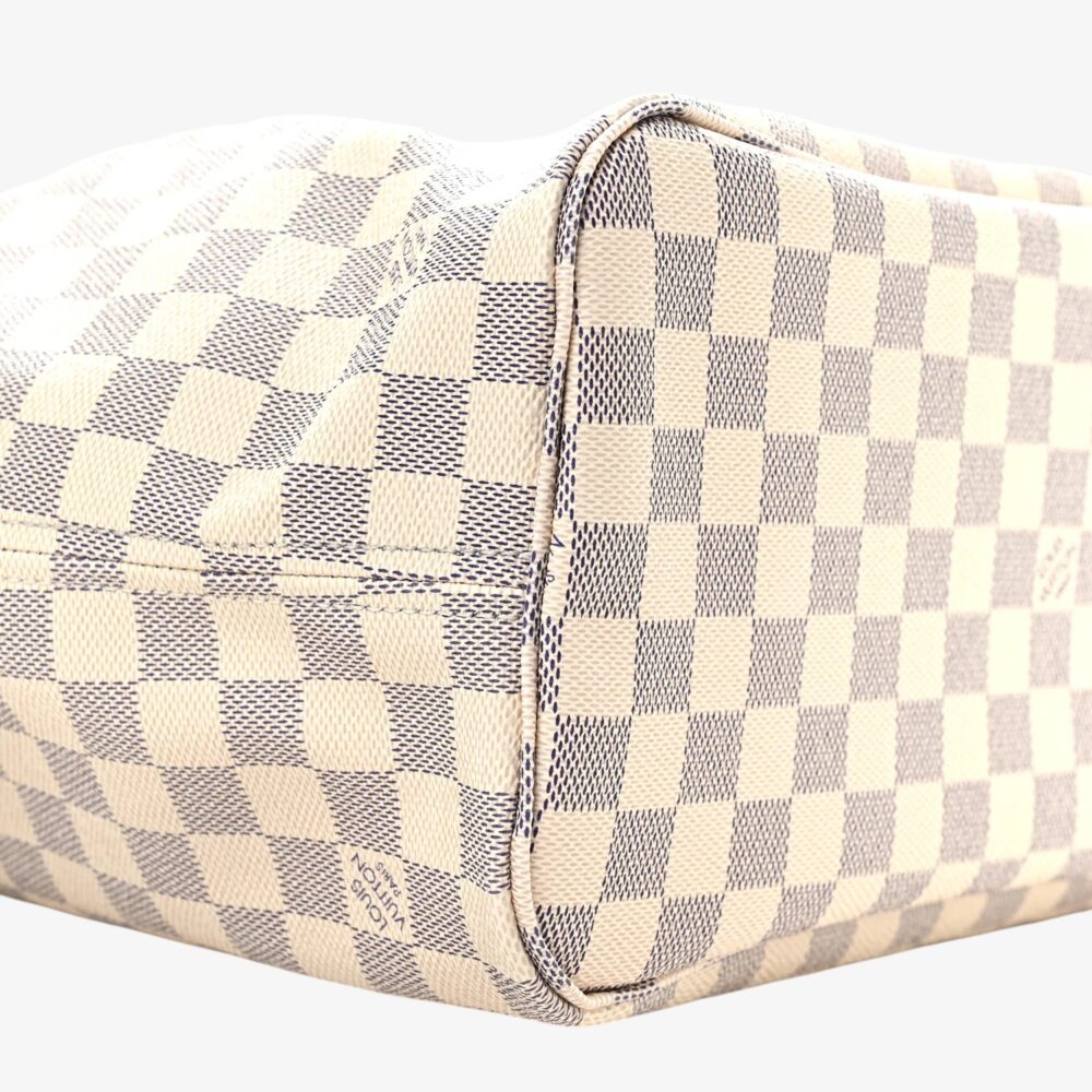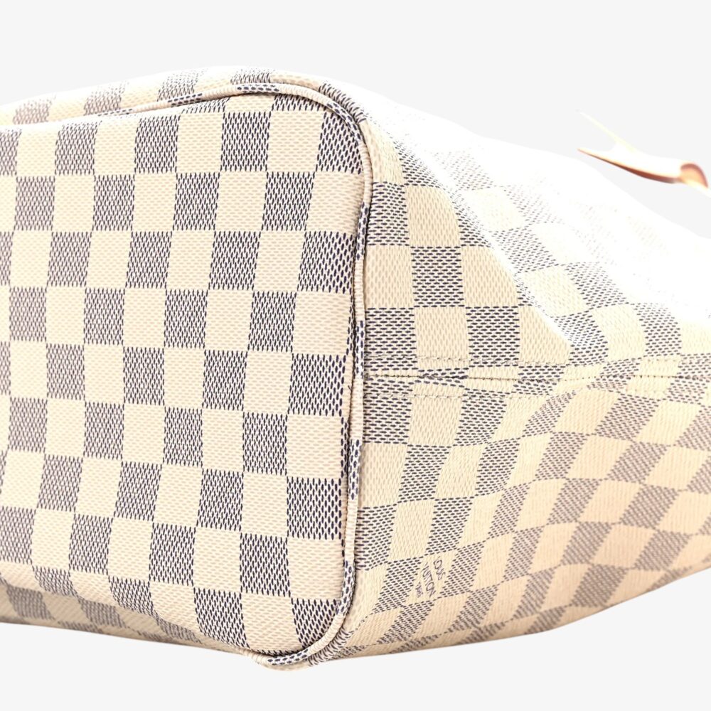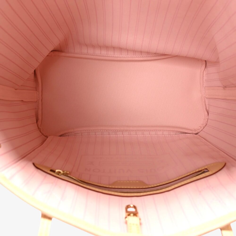 The Louis Vuitton Damier Azur Neo Neverfull MM Rose Ballerine features classic Damier Azur Neo canvas with soft pink accents for a feminine touch.
