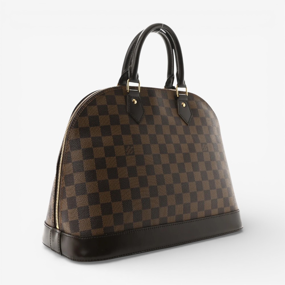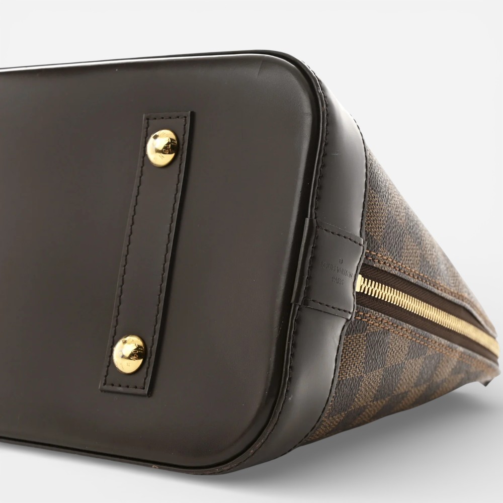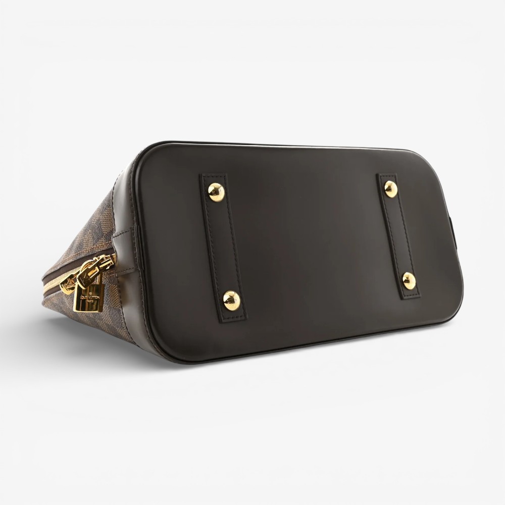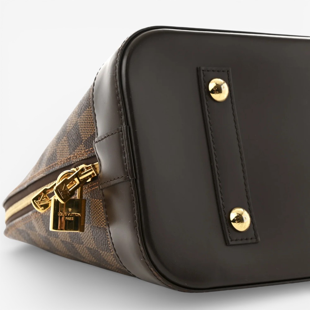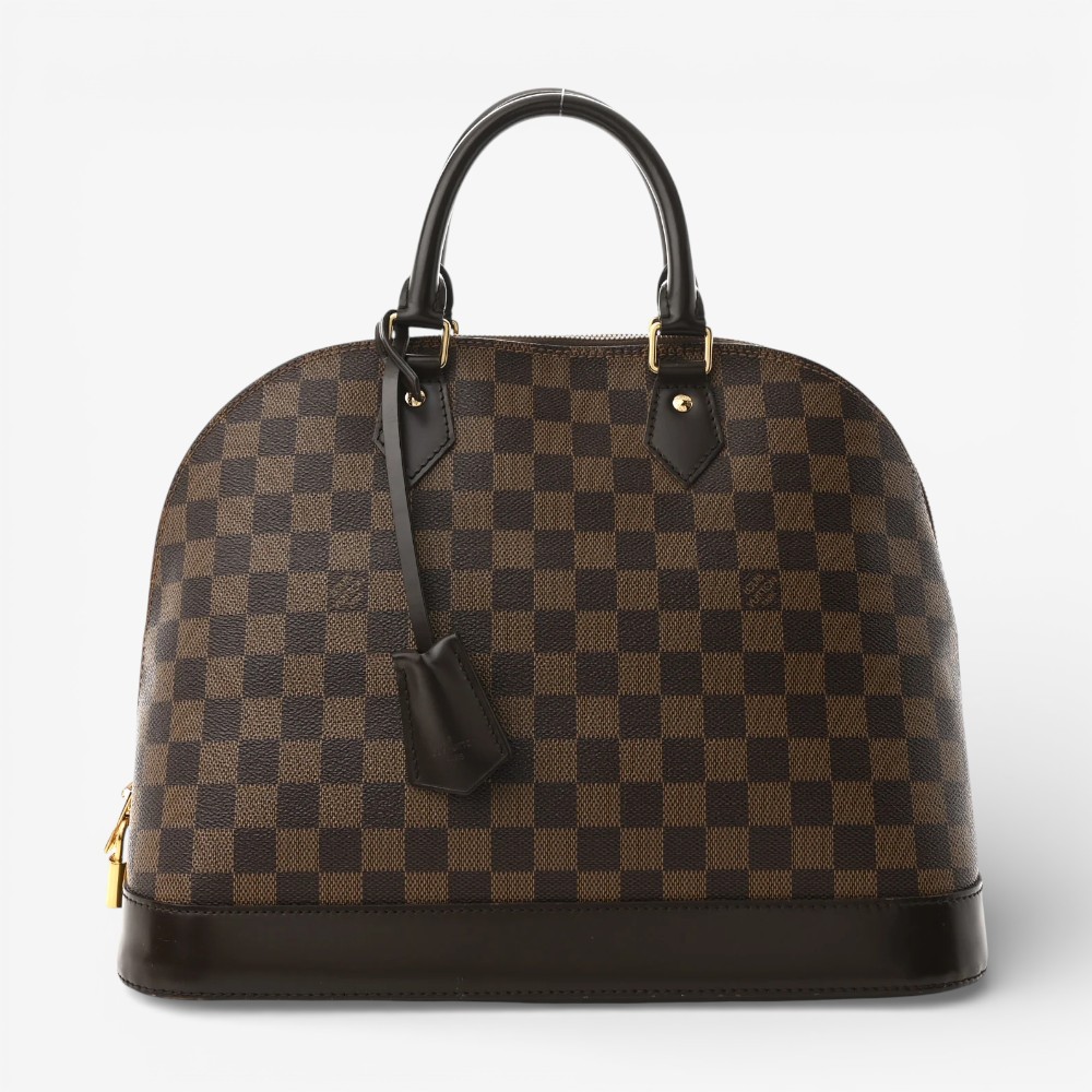 Louis Vuitton Alma MM in classic Damier Ebene canvas with refined leather trim and polished hardware. A chic luxury handbag perfect for everyday elegance.