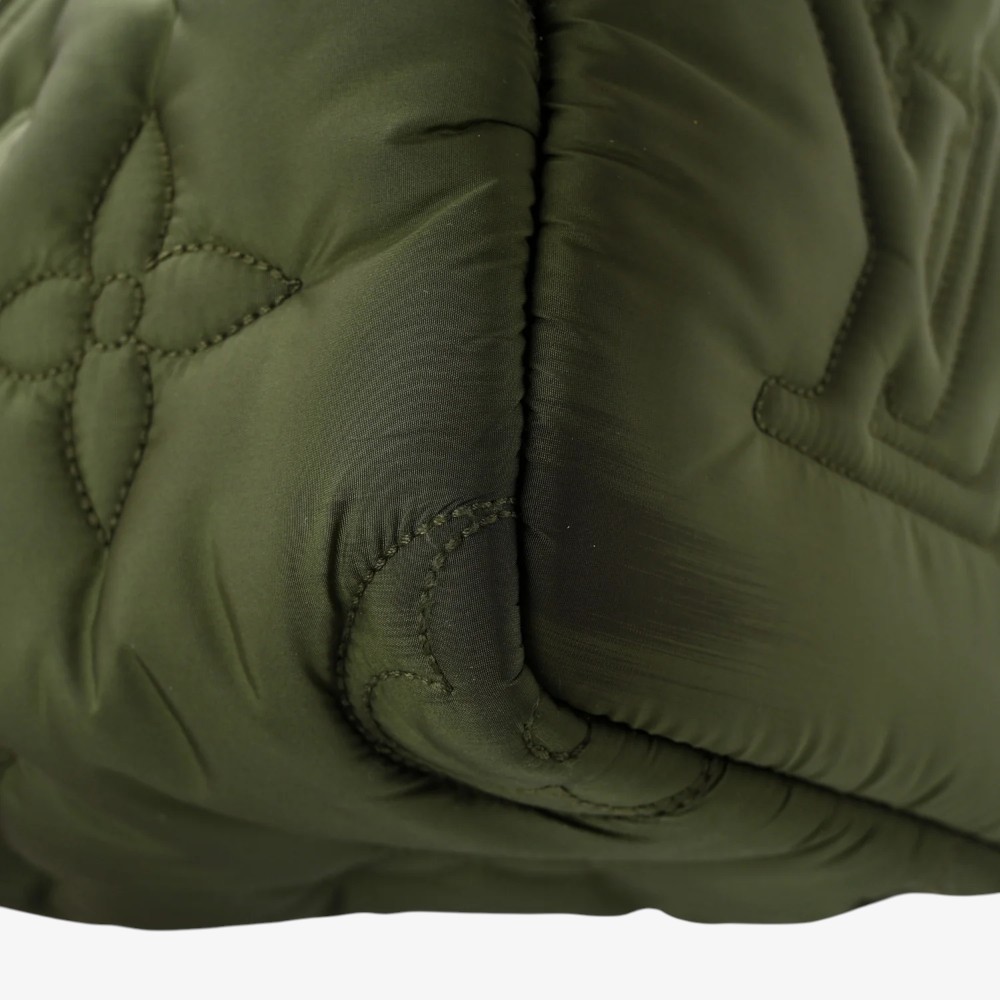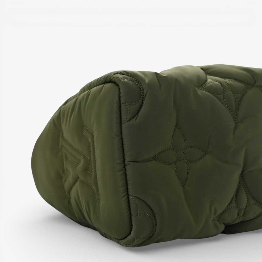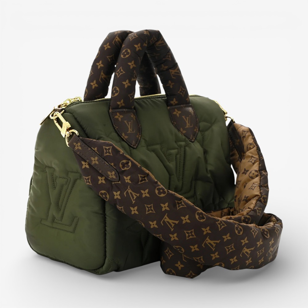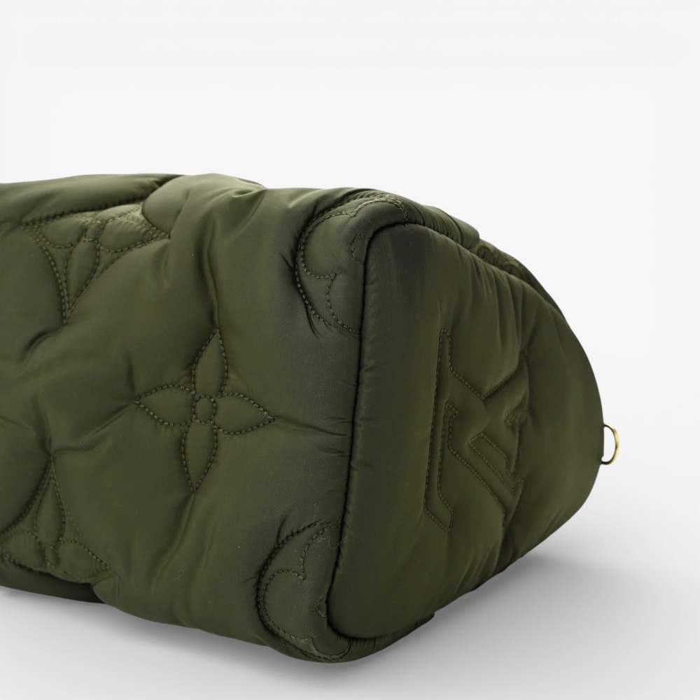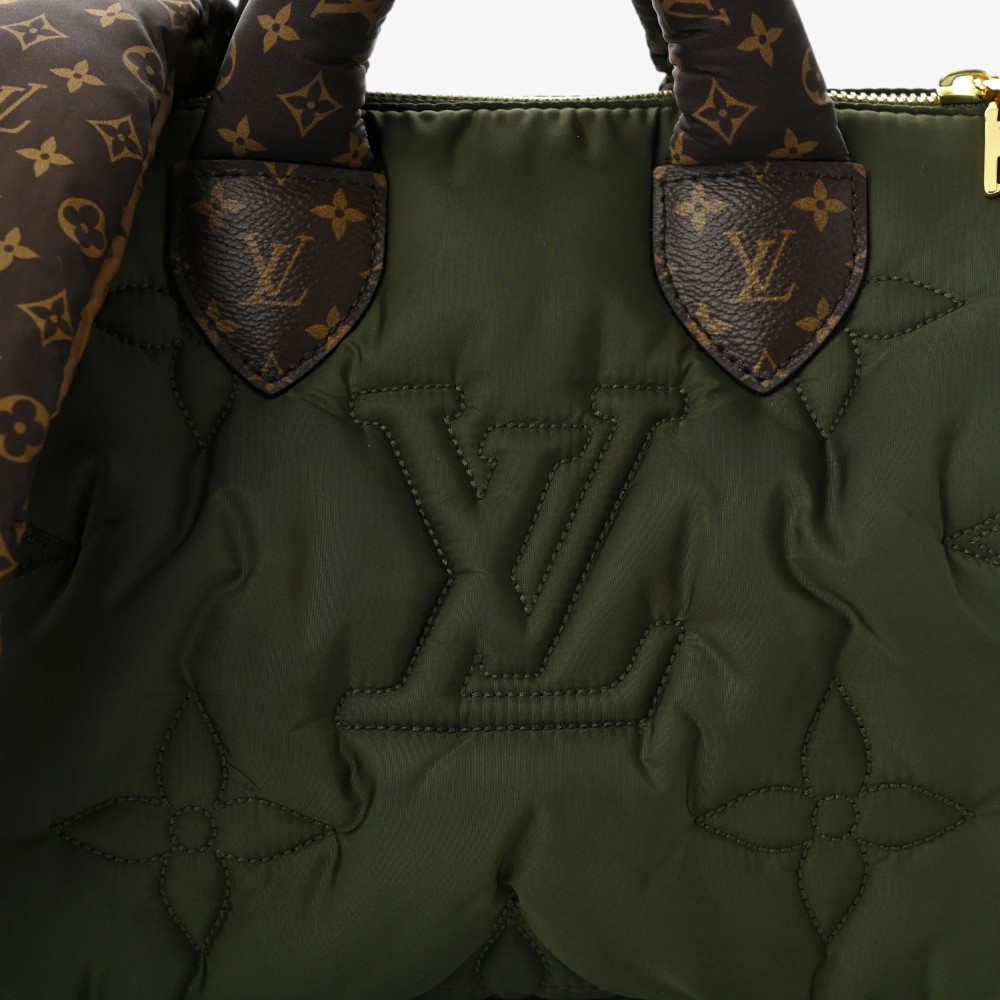 Louis Vuitton Pillow Speedy Bandoulière 25 in khaki Econyl Monogram with plush quilted texture and refined leather trim. A chic luxury handbag perfect for everyday elegance.