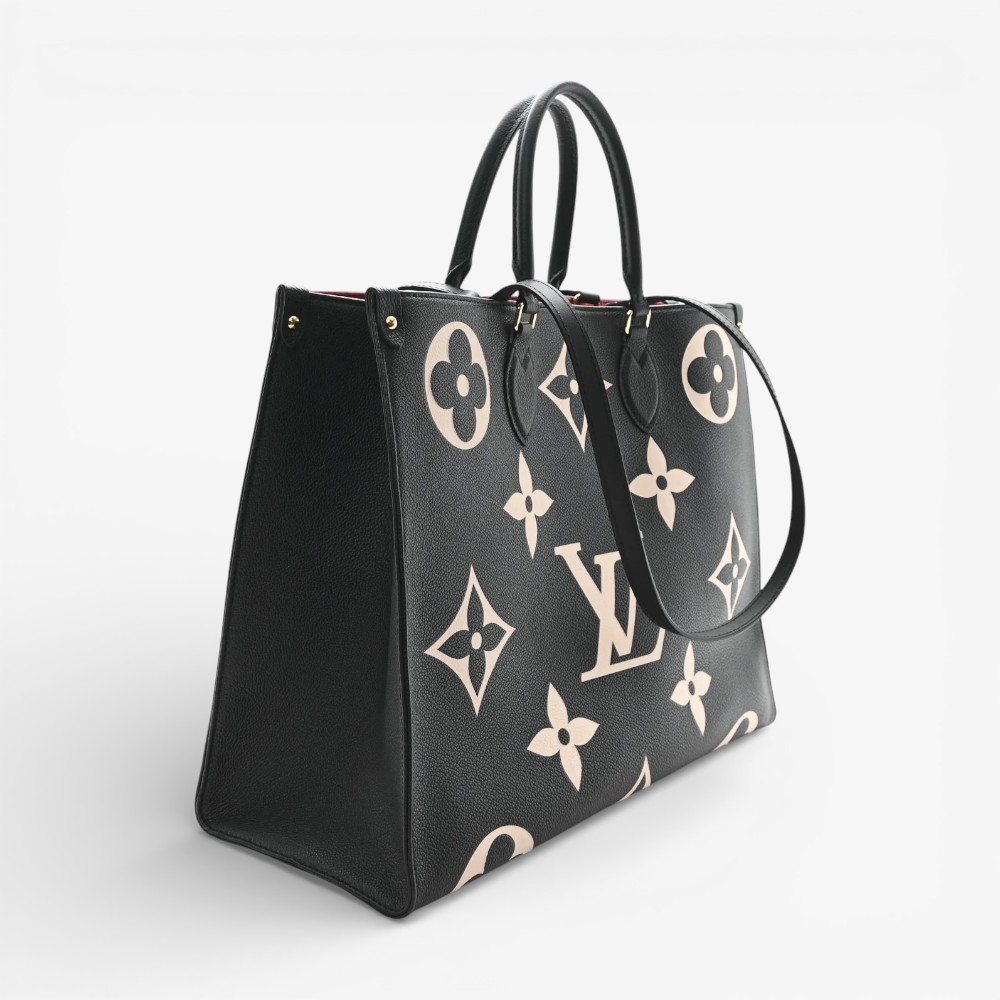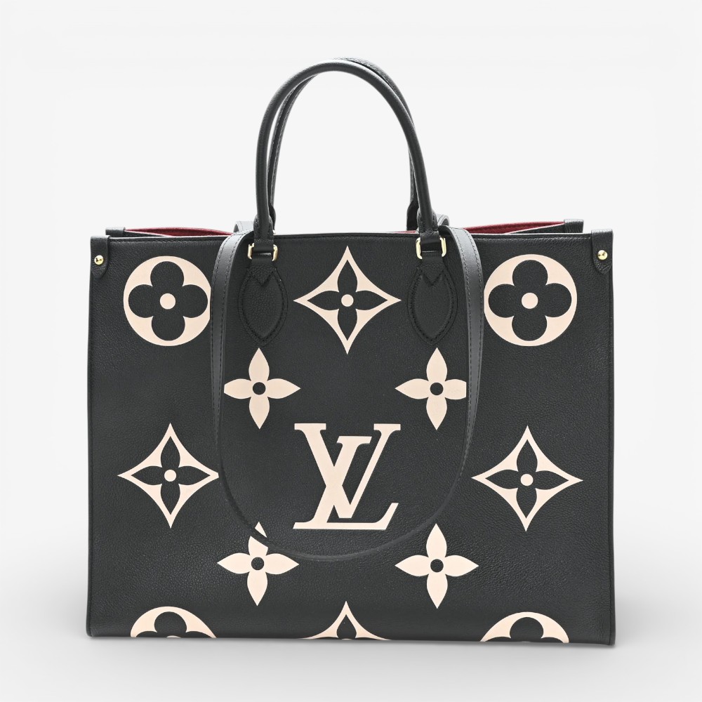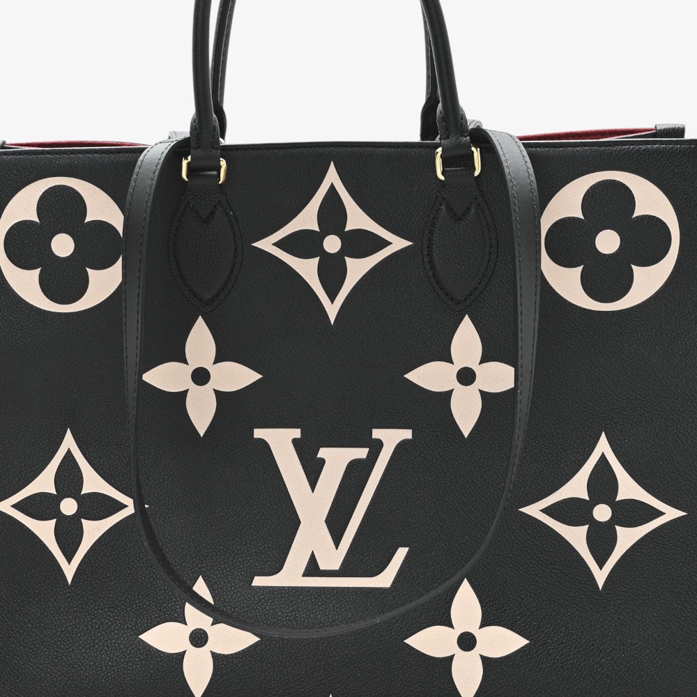 Louis Vuitton Onthego GM in embossed Empreinte Monogram Giant leather with black and beige tones. A spacious luxury tote bag perfect for everyday elegance.