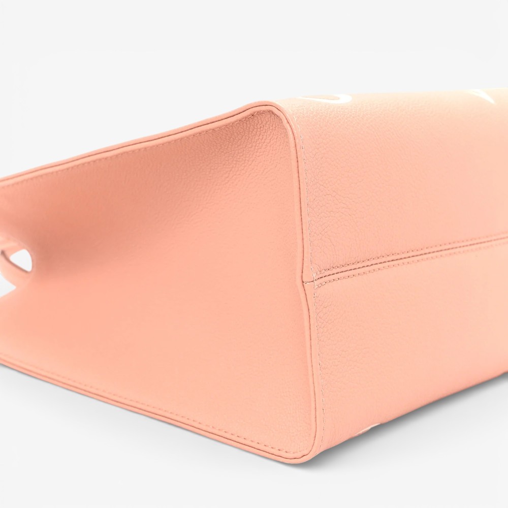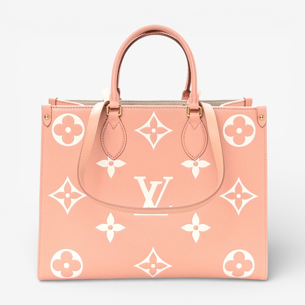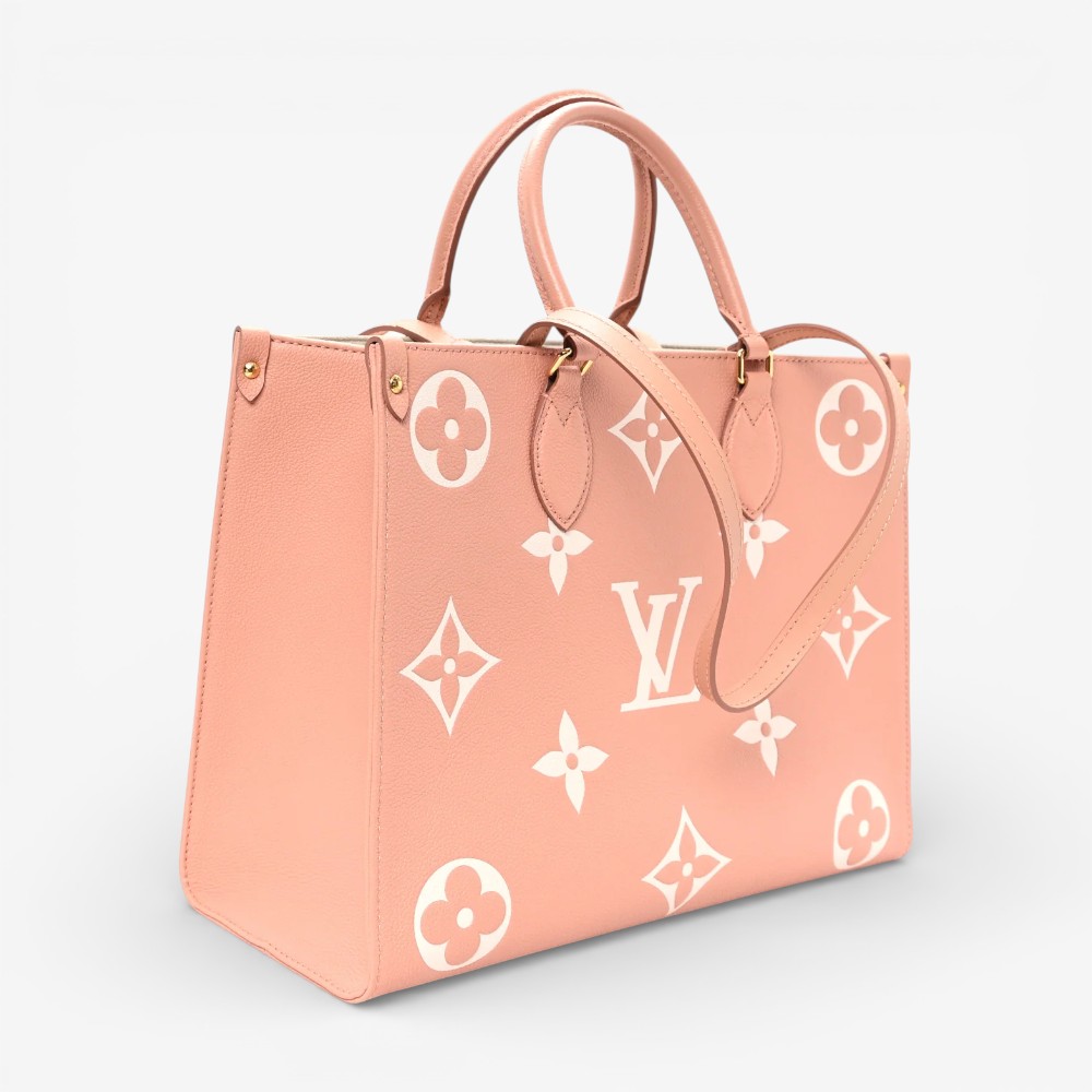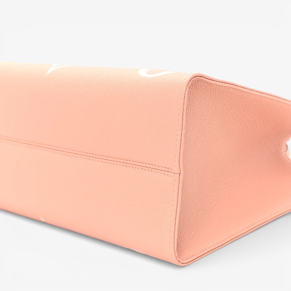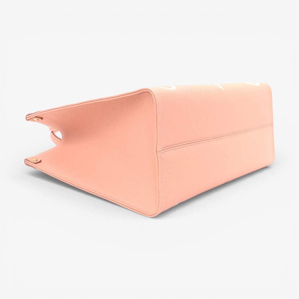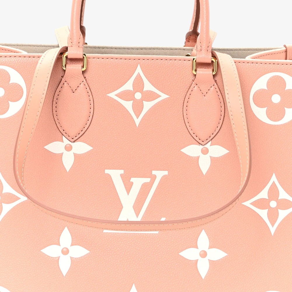 The Louis Vuitton Empreinte Monogram Giant Onthego MM Rose Trianon Crème features bold embossed Monogram Giant leather with soft rose and crème tones for standout luxury style. Designed with leather top handles and long shoulder straps for versatile and comfortable carry options. This luxury designer tote bag offers a roomy interior ideal for daily essentials with polished sophistication. A chic Louis Vuitton tote bag perfect for everyday use or elevated casual outfits.