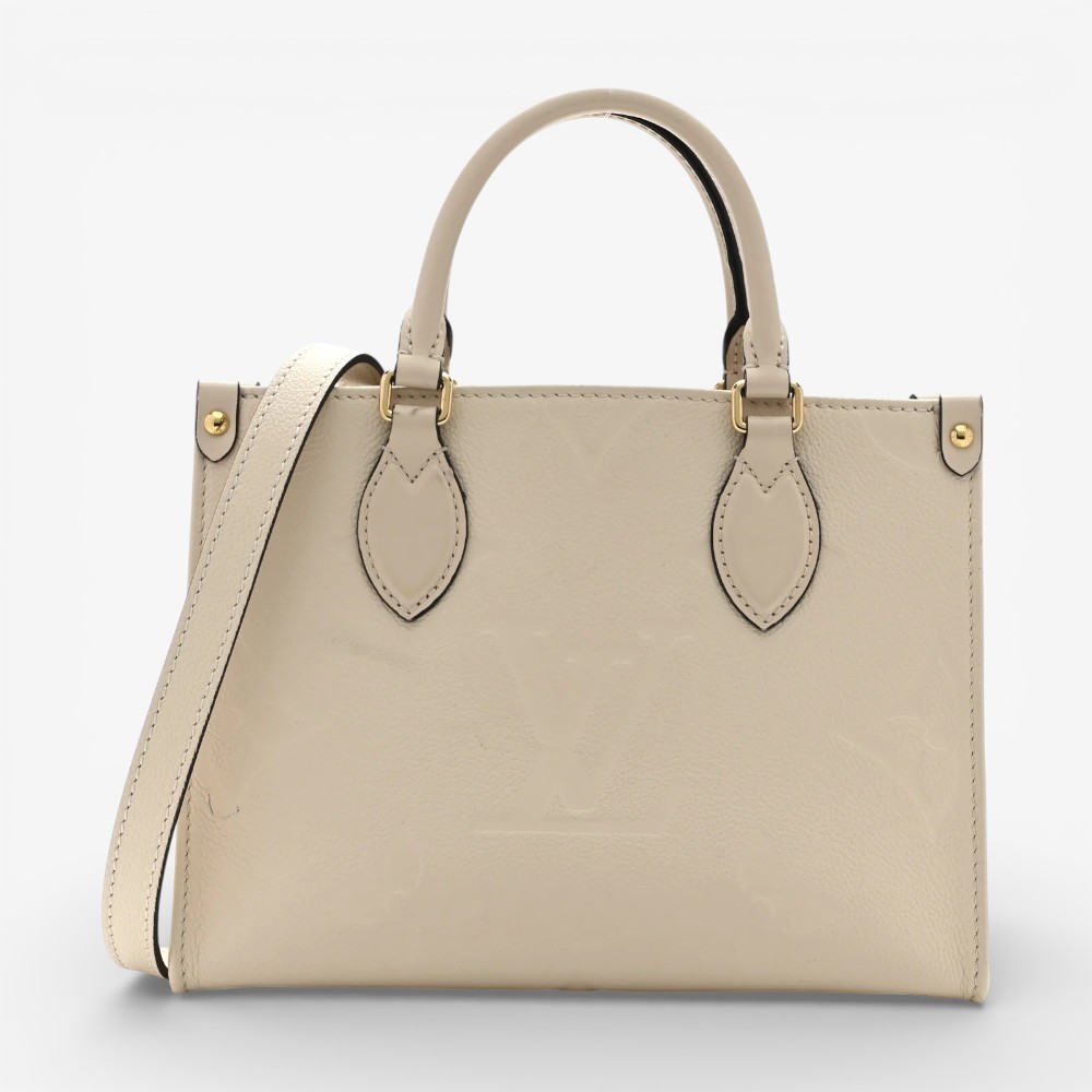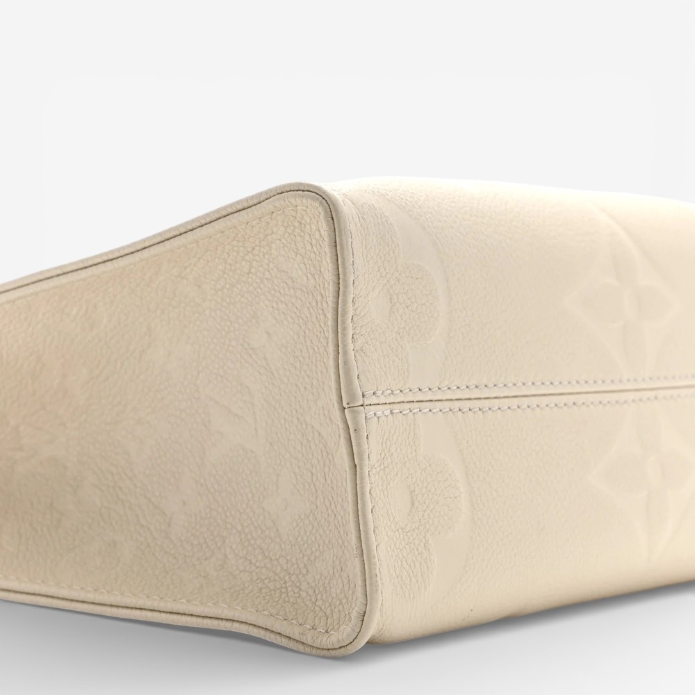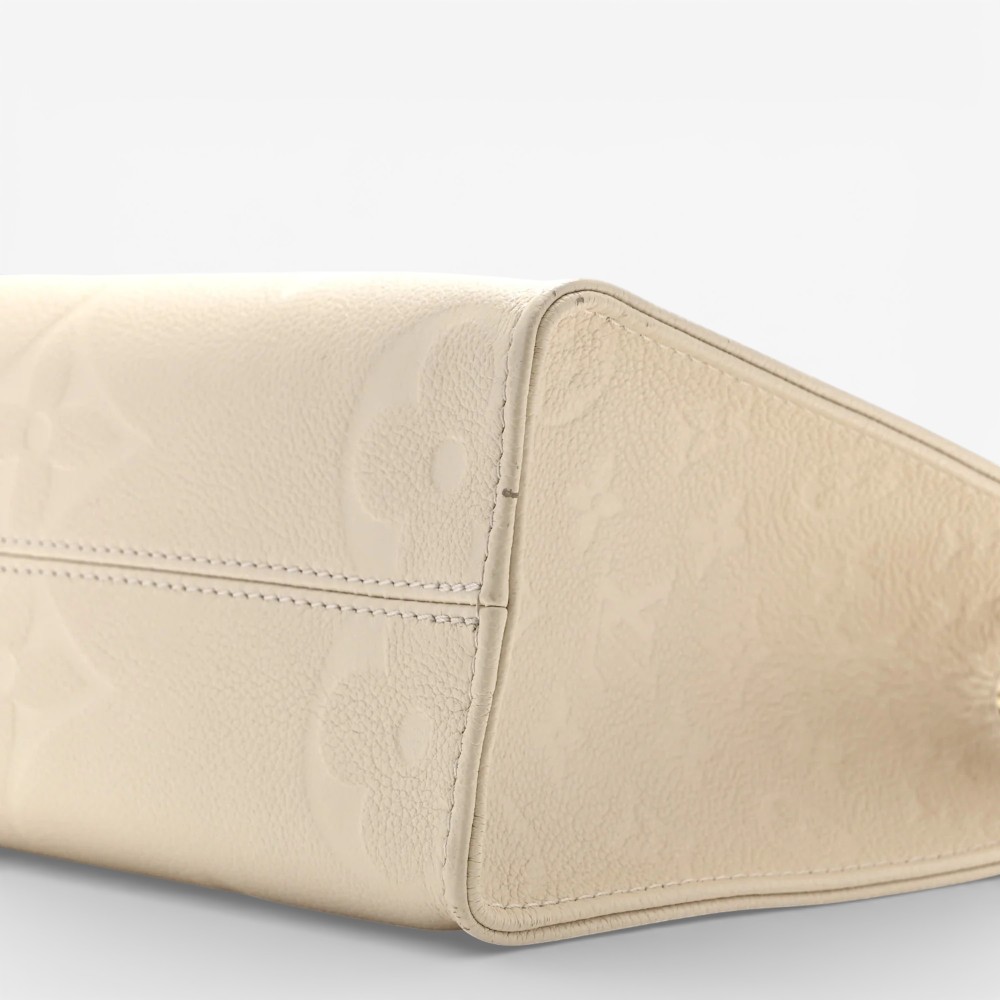 Louis Vuitton Onthego PM in embossed Empreinte Monogram Giant leather with soft cream beige tones. A stylish luxury tote bag perfect for everyday elegance.