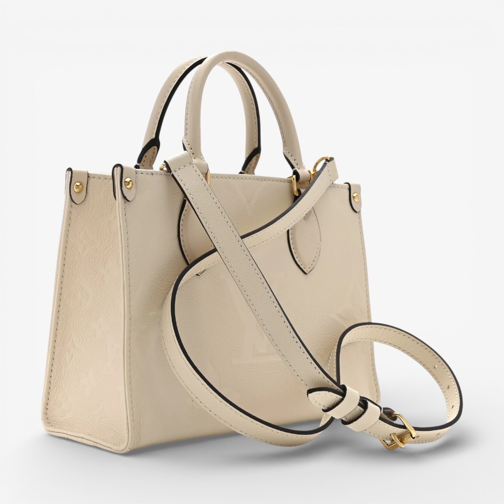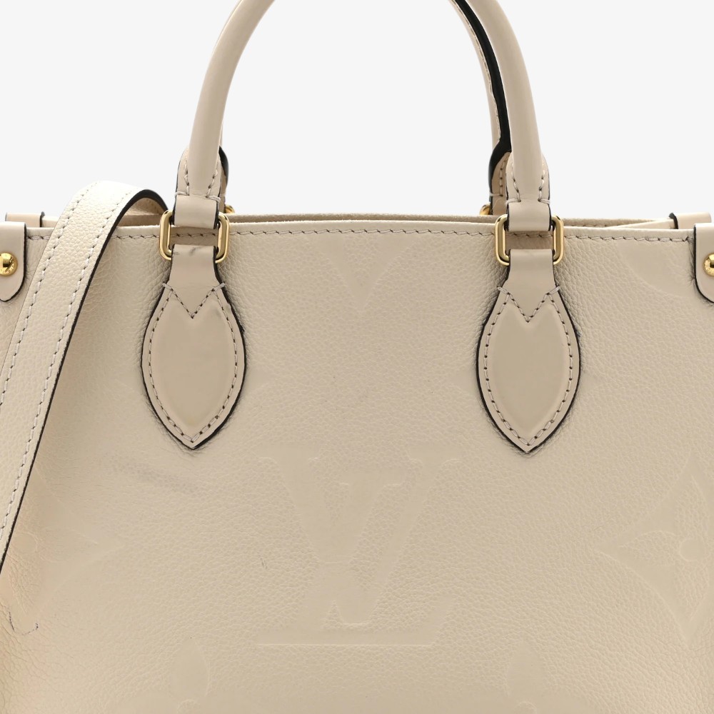 The Louis Vuitton Empreinte Monogram Giant Onthego PM Cream Beige features embossed Monogram Giant leather in elegant cream beige hues for standout luxury style. Designed with leather top handles and shoulder straps for versatile and comfortable carry options. This luxury designer tote bag offers a roomy interior ideal for daily essentials with polished sophistication. A chic Louis Vuitton tote bag perfect for everyday use or elevated casual outfits.