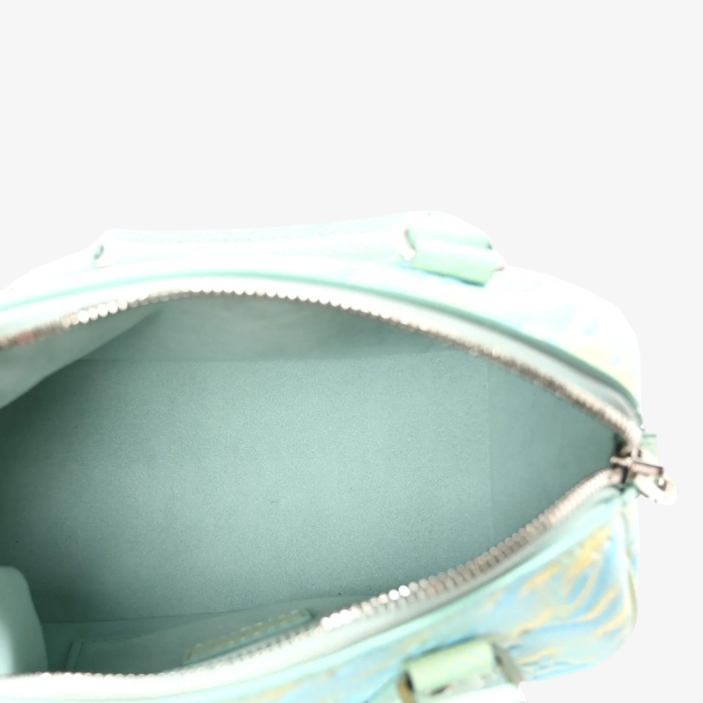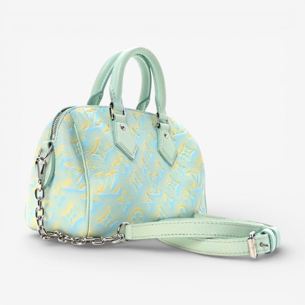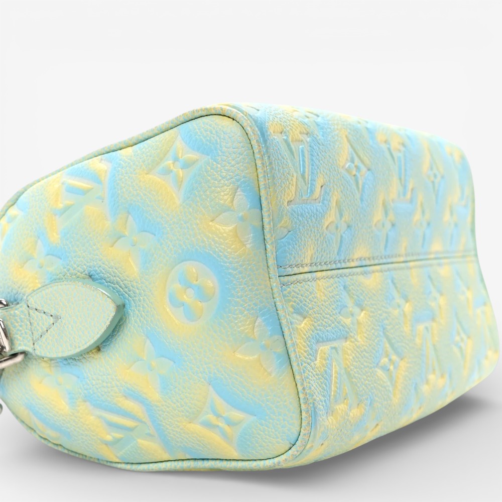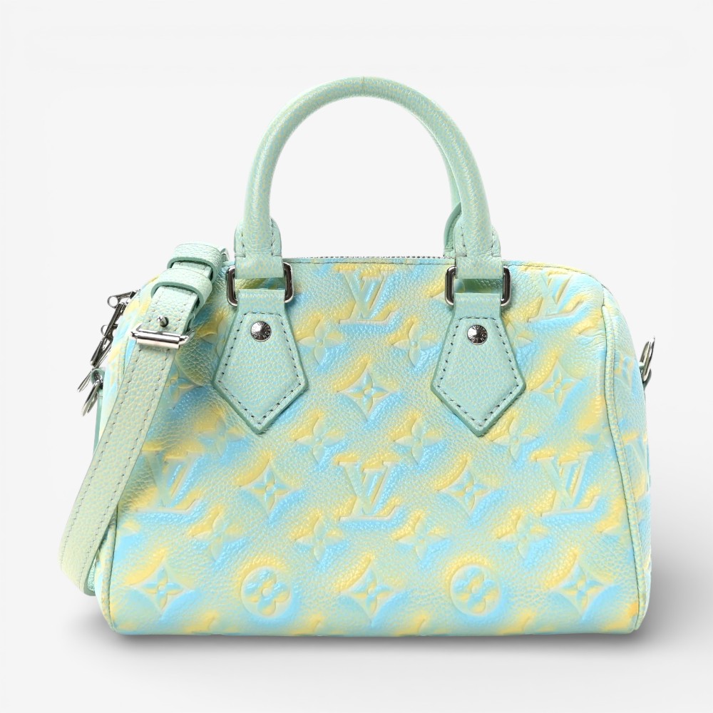 The Louis Vuitton Empreinte Monogram Summer Stardust Nano Speedy Water Green features embossed Empreinte Monogram leather with artistic stardust water green detailing for standout luxury style. Designed with a compact silhouette, top handle, and refined hardware for timeless sophistication. This luxury designer mini bag offers a snug interior ideal for carrying small daily essentials with polished appeal. A stylish Louis Vuitton mini handbag perfect for everyday use or elevated outfits.