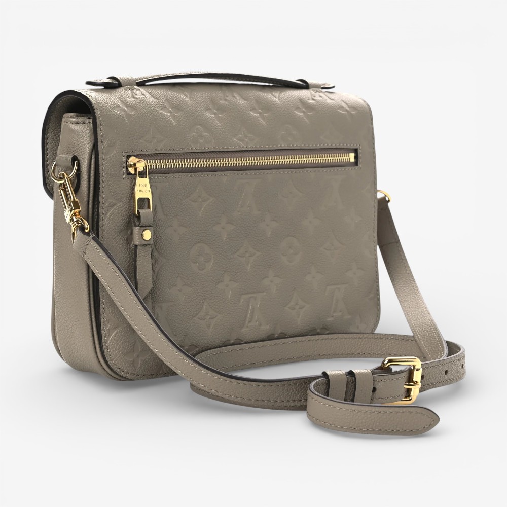 The Louis Vuitton Empreinte Pochette Métis Tourterelle features premium embossed Empreinte Monogram leather in subtle tourterelle hues for standout luxury style. Designed with a structured silhouette, top handle, and adjustable shoulder strap for versatile carry options. This luxury designer bag offers a well-organized interior ideal for daily essentials with polished sophistication. A stylish Louis Vuitton crossbody perfect for everyday use or elevated casual outfits.