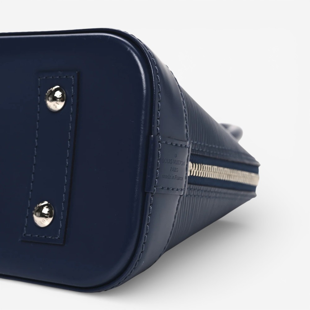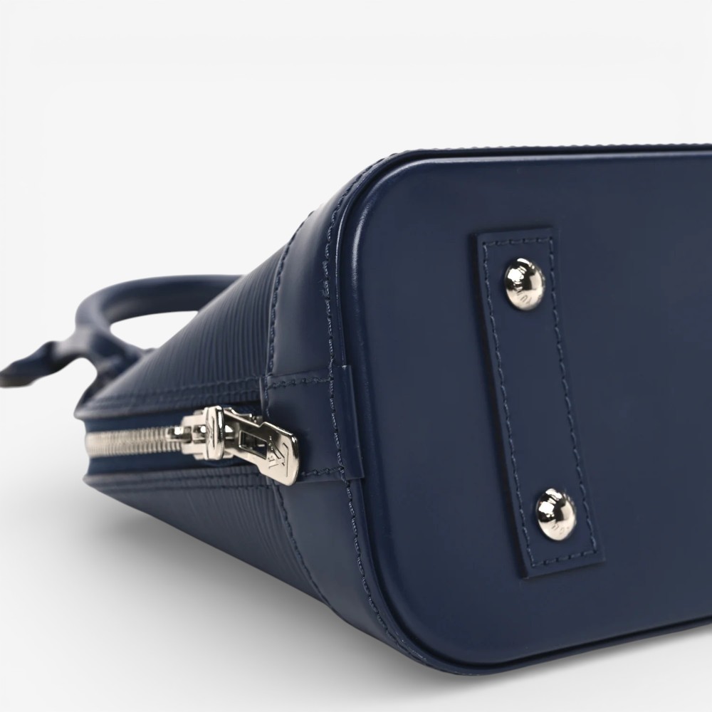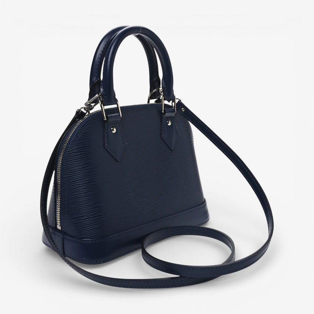 Louis Vuitton Alma BB in indigo Epi leather with refined leather trim and polished hardware. A chic luxury mini handbag perfect for everyday elegance.