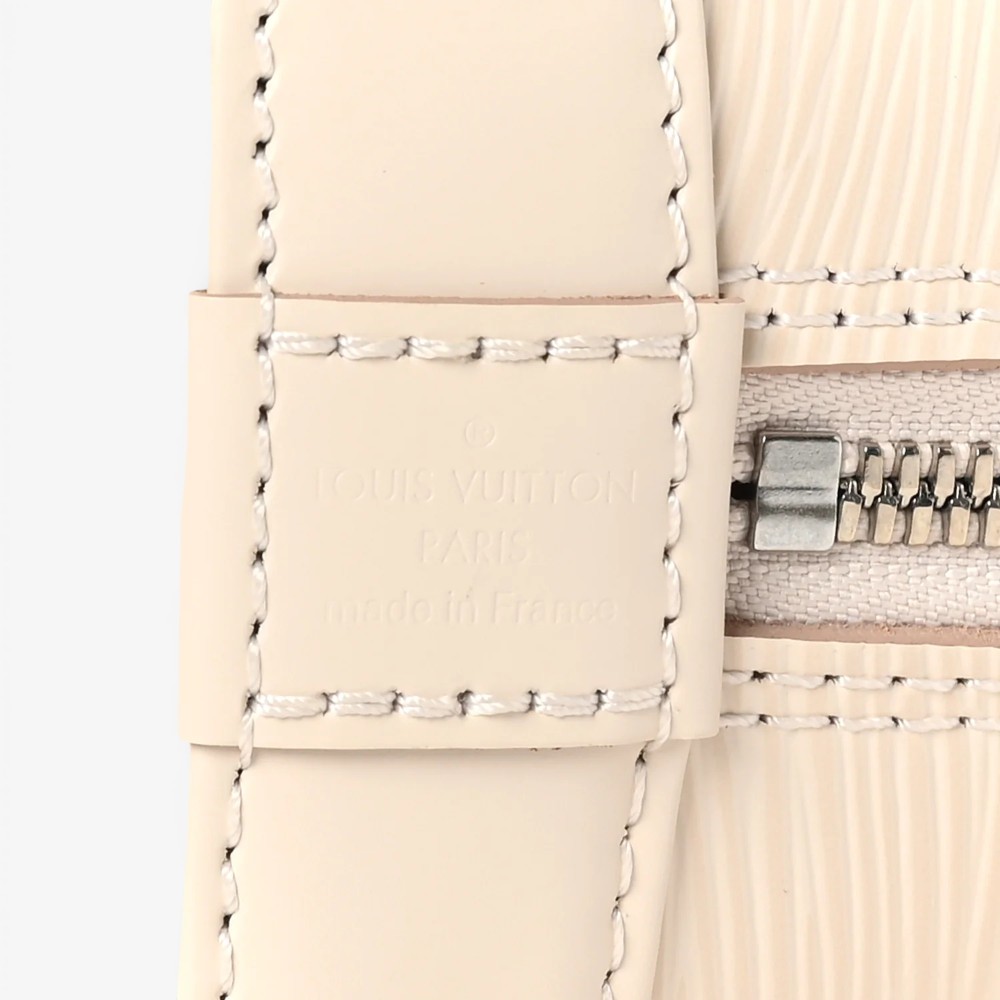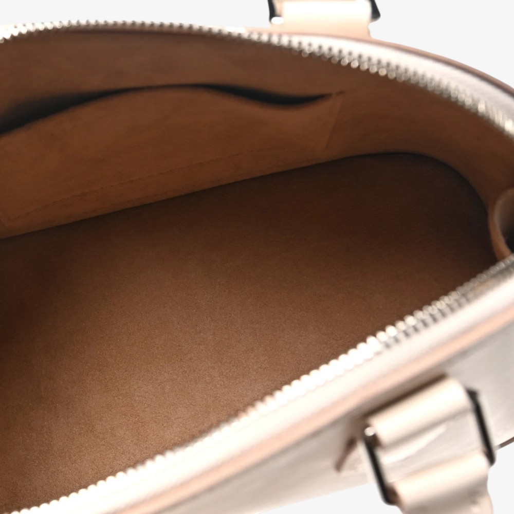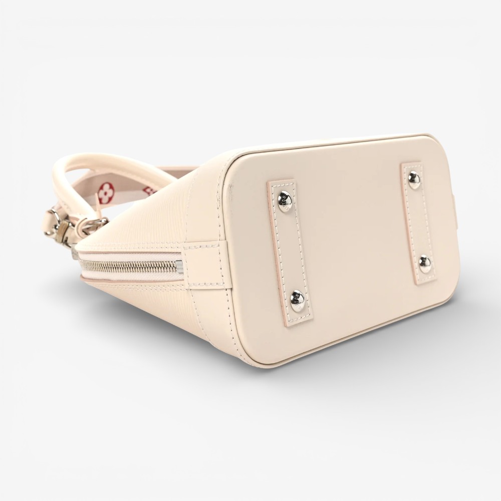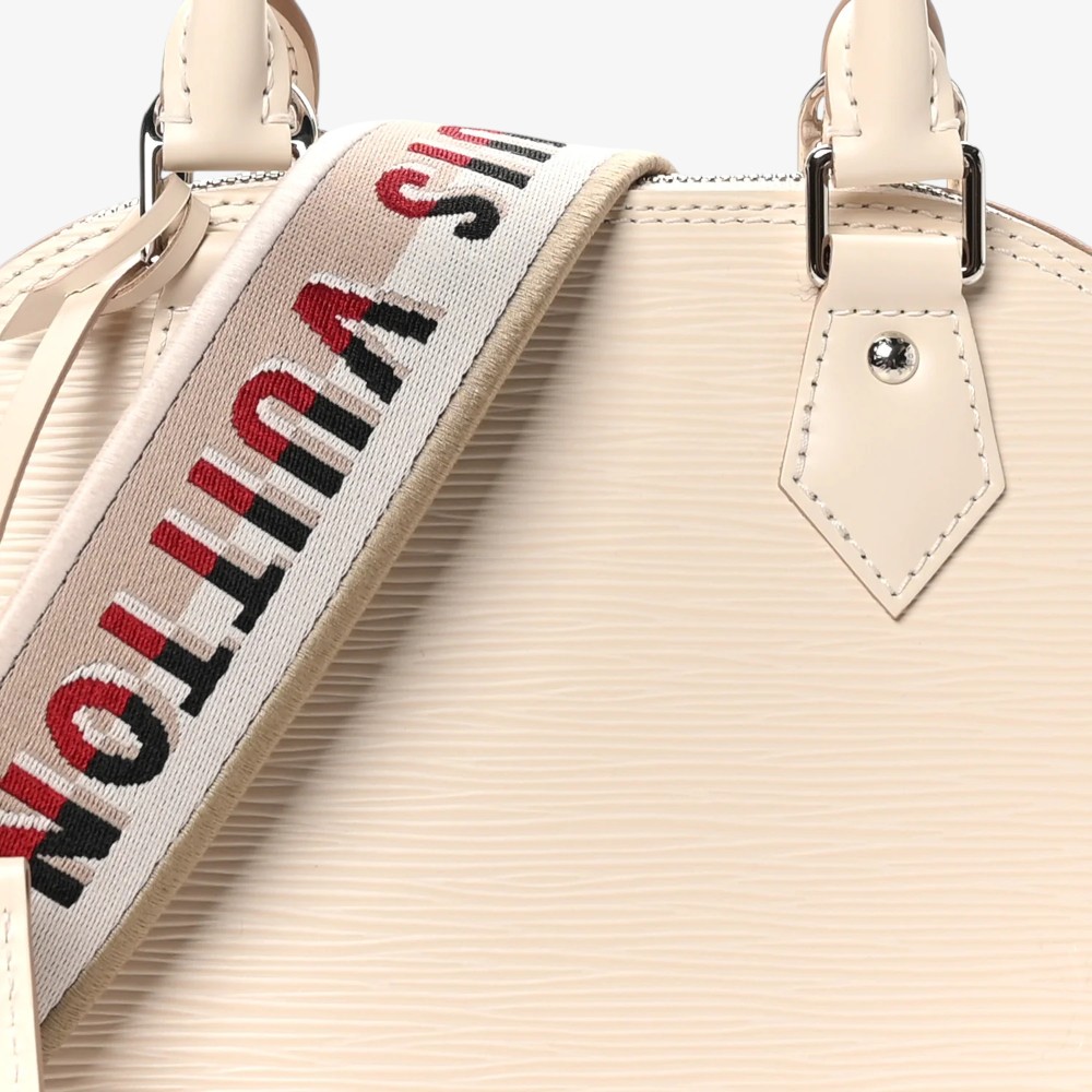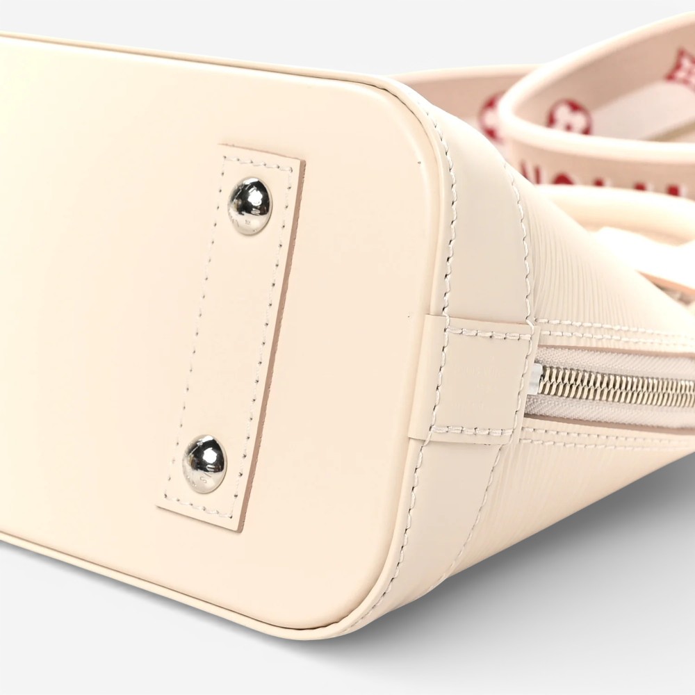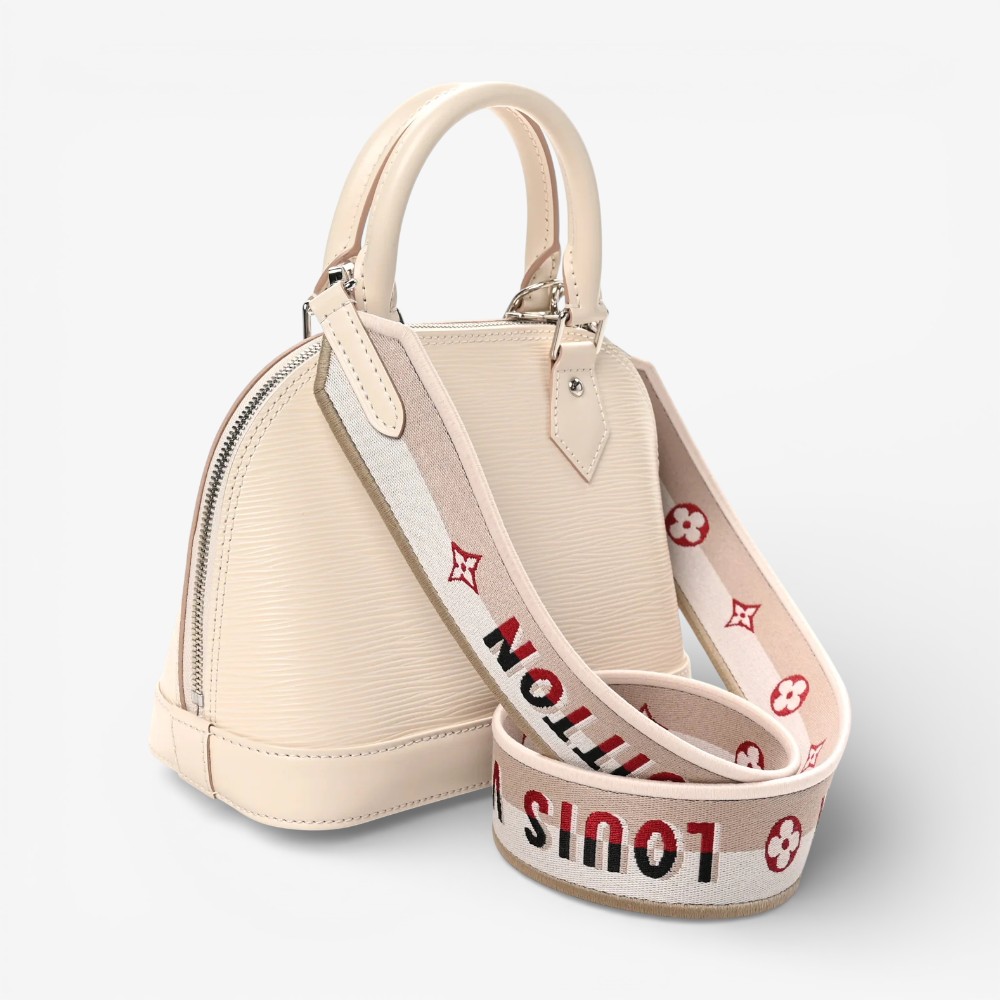 Louis Vuitton Alma BB in Epi Jacquard canvas with soft quartz accents and refined leather trim. A chic luxury mini handbag perfect for everyday elegance.