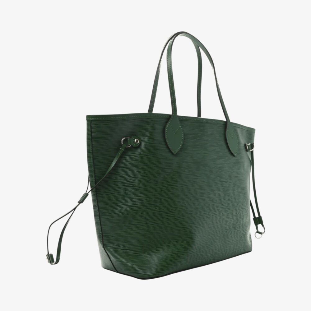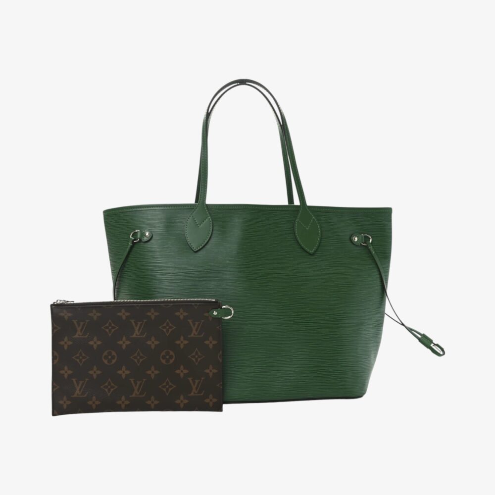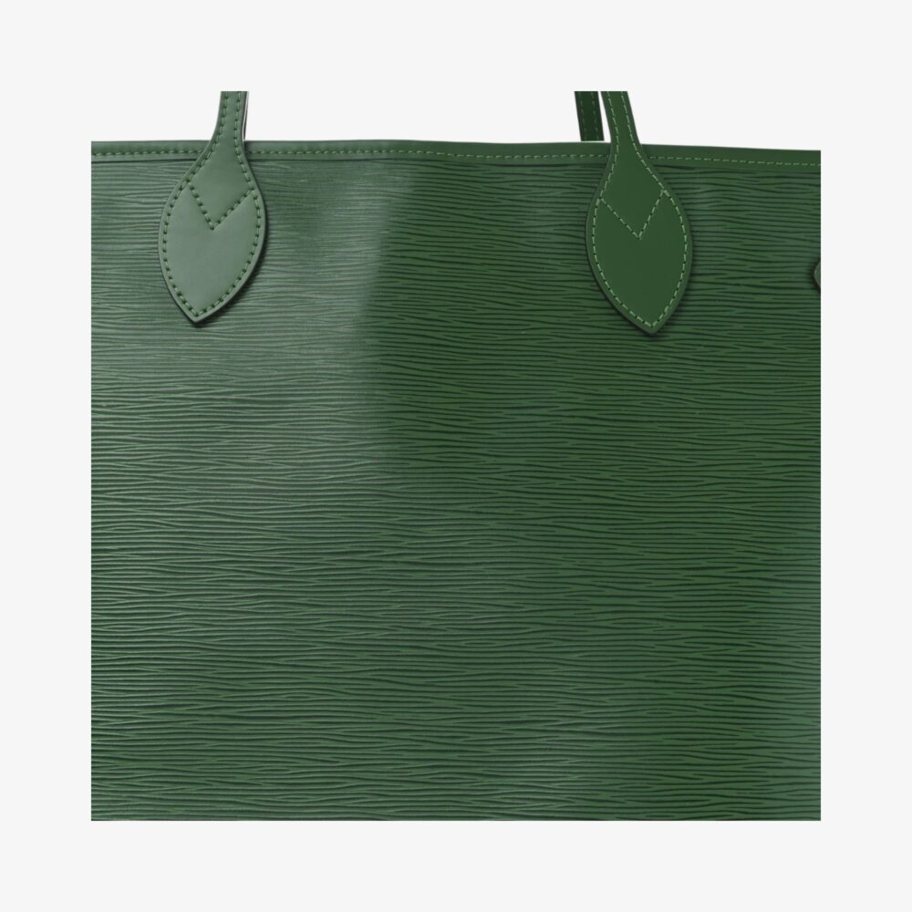 Refined Louis Vuitton Neverfull MM in textured Epi leather with Borneo Green finish and elegant leather trim. A spacious and stylish luxury tote for everyday wear.