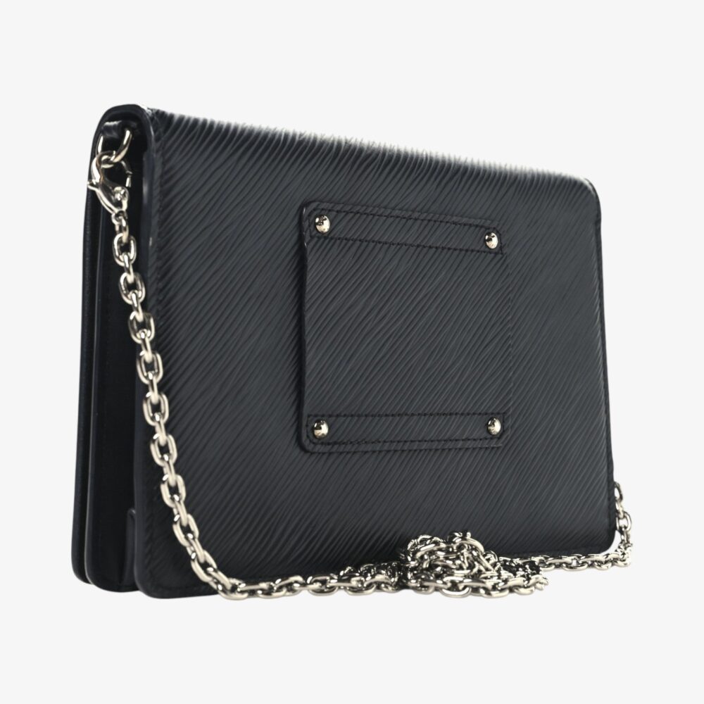 Louis Vuitton Twist Belt Chain Wallet in black Epi leather with signature LV Twist clasp and versatile chain belt. A chic luxury accessory for elevated style.