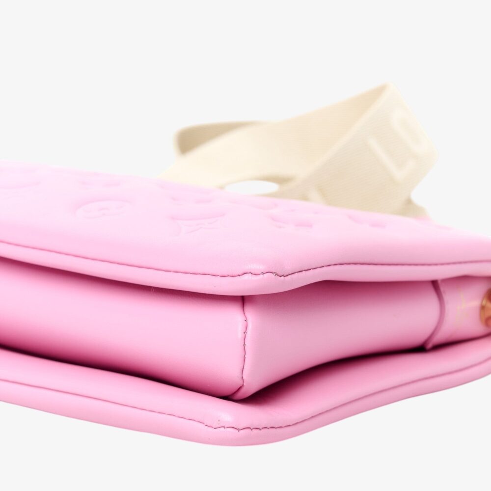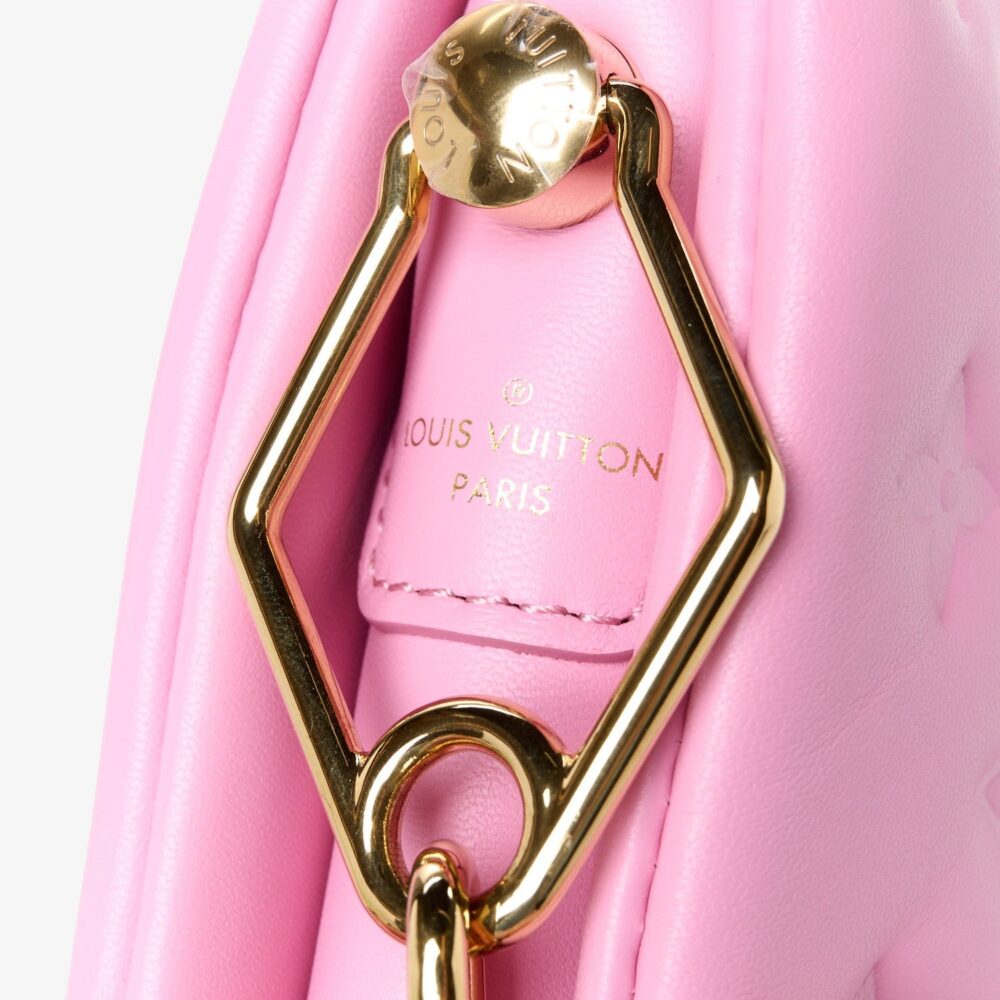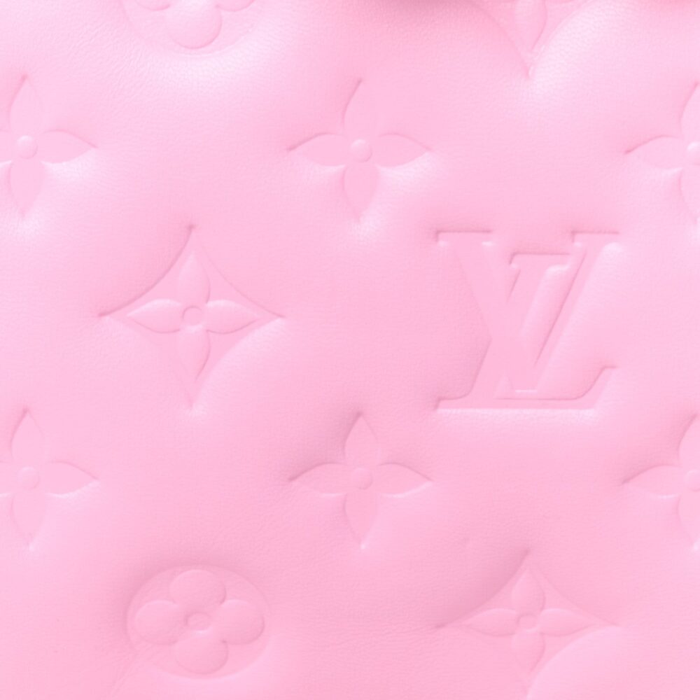 Louis Vuitton Coussin PM in rose bonbon lambskin with embossed Monogram and plush padded design. A chic luxury handbag perfect for everyday elegance.