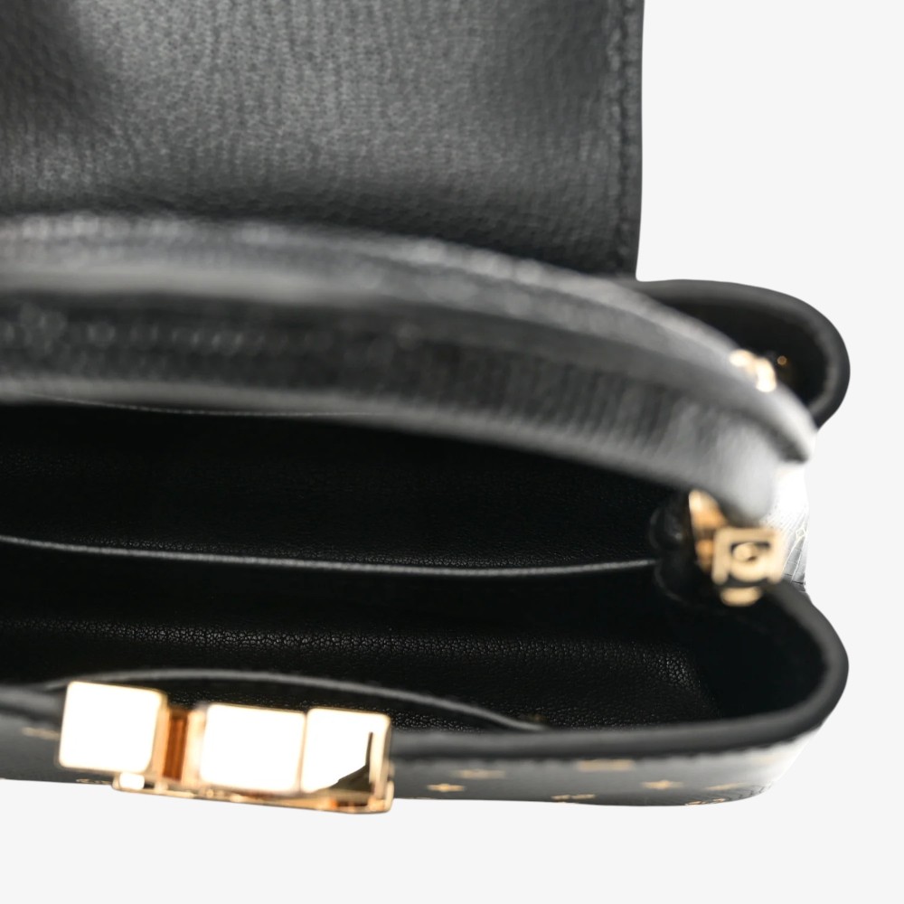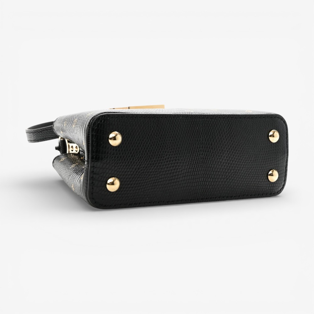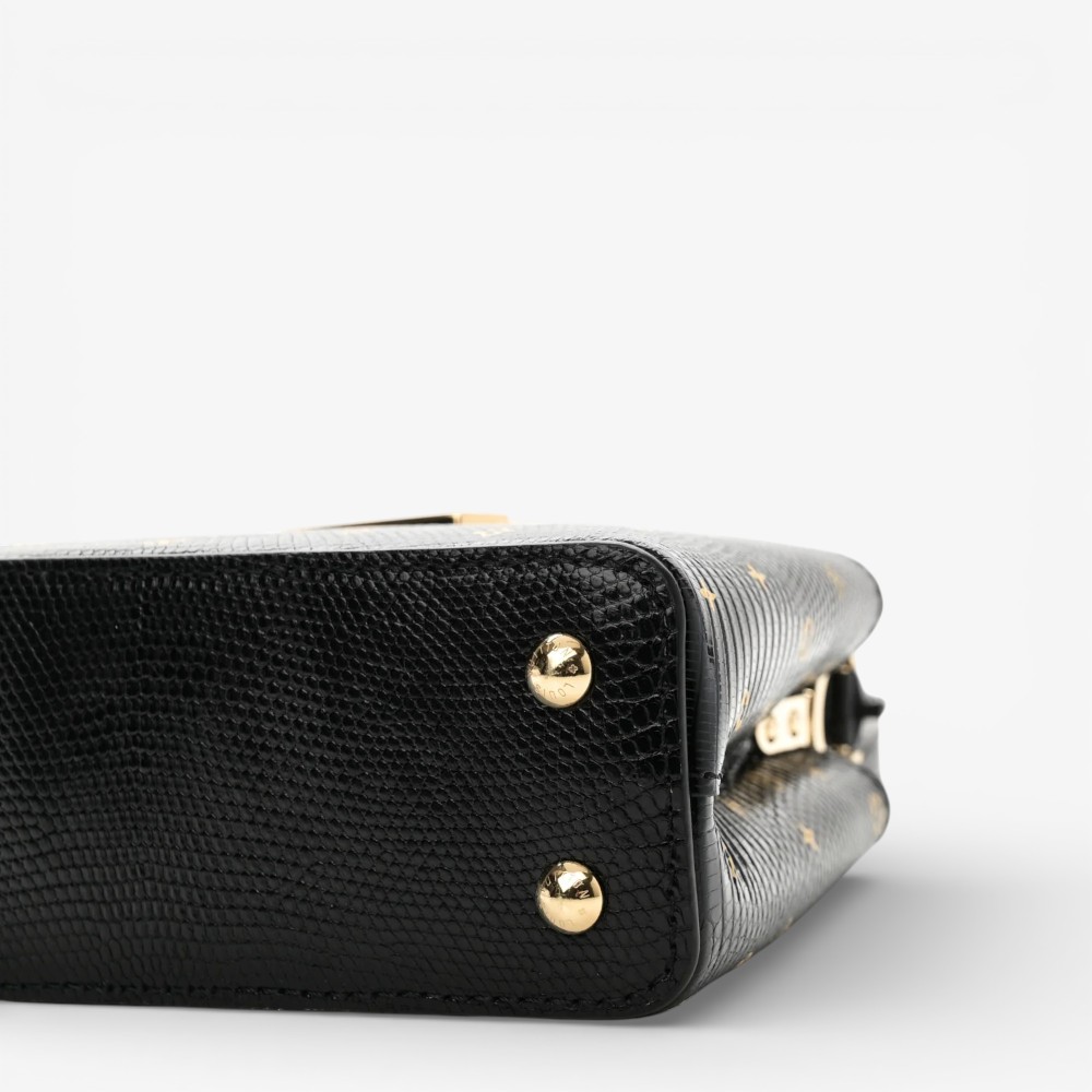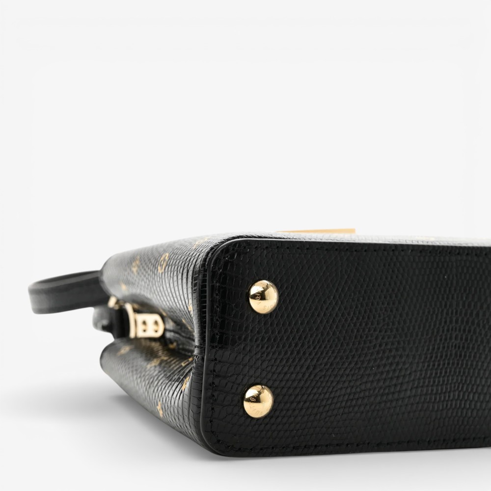 Louis Vuitton Capucines Mini in black lizard leather with refined hardware. A chic luxury handbag perfect for everyday elegance.
