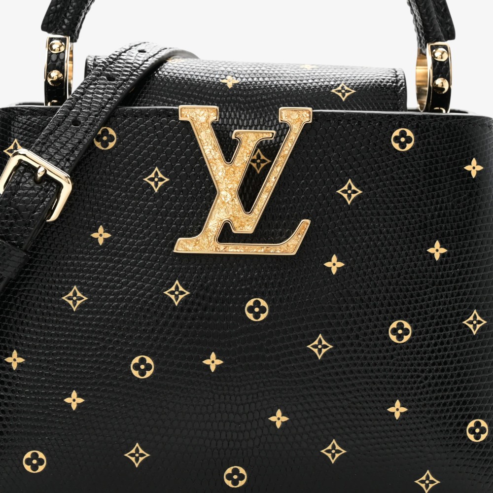 The Louis Vuitton Lizard Capucines Mini Black features exotic lizard leather for standout luxury style and tactile sophistication. Designed with the signature Mini Capucines silhouette, elegant top handle, and polished hardware for timeless appeal. This luxury designer handbag offers a compact interior ideal for daily essentials with refined flair. A stylish Louis Vuitton mini bag perfect for everyday use or elevated occasions.