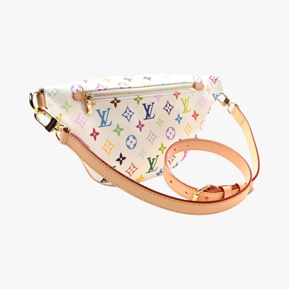 The Louis Vuitton LV x TM Monogram Multicolor High Rise Bumbag White features iconic Multicolor Monogram canvas with bold graphic print for standout design. Finished with premium leather trim and polished hardware for elevated luxury style. This luxury designer bumbag offers a compact interior ideal for essentials like phone, wallet, and keys. A chic Louis Vuitton belt bag perfect for everyday wear or travel.
