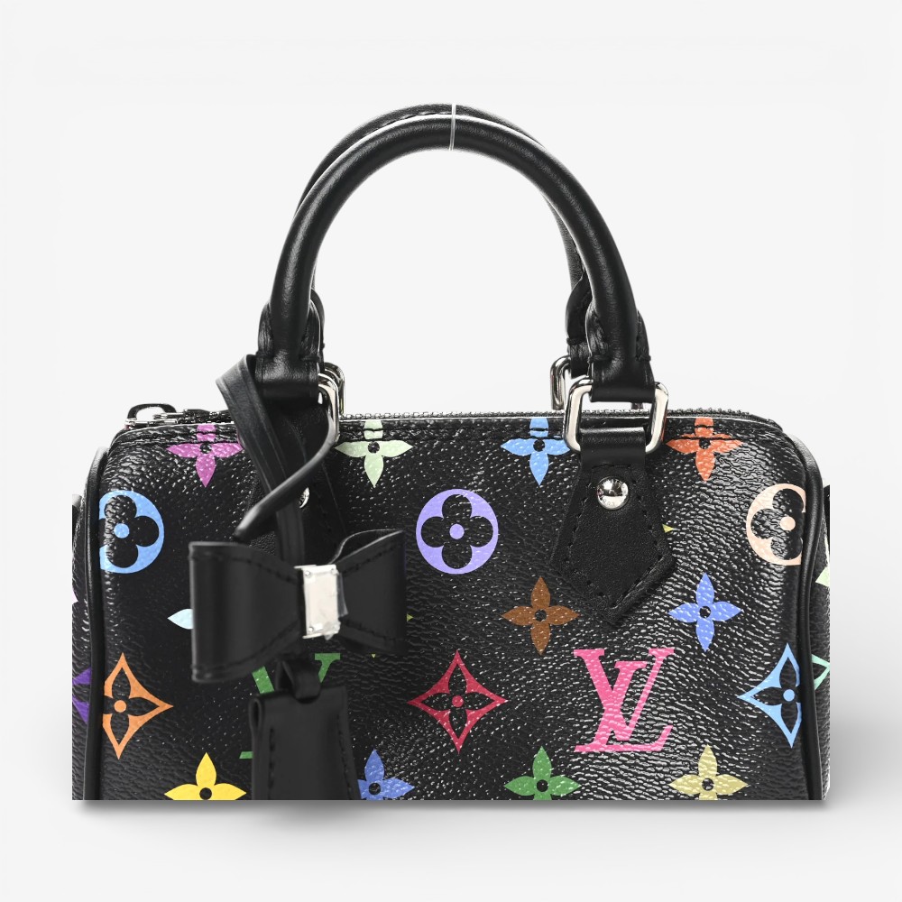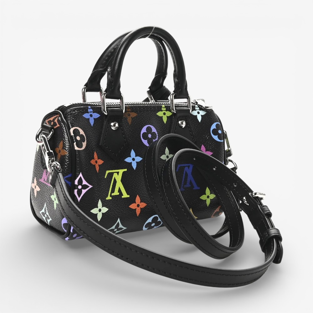 The Louis Vuitton LV x TM Monogram Multicolor Nano Speedy Black features vibrant LV x TM multicolor Monogram canvas for standout luxury style. Designed with a compact silhouette, top handle, and refined hardware for timeless sophistication. This luxury designer mini bag offers a snug interior ideal for carrying small daily essentials with polished appeal. A stylish Louis Vuitton mini handbag perfect for everyday wear or elevated outfits.