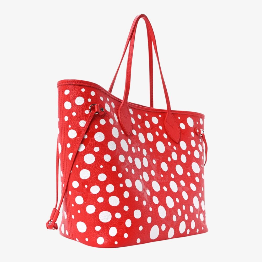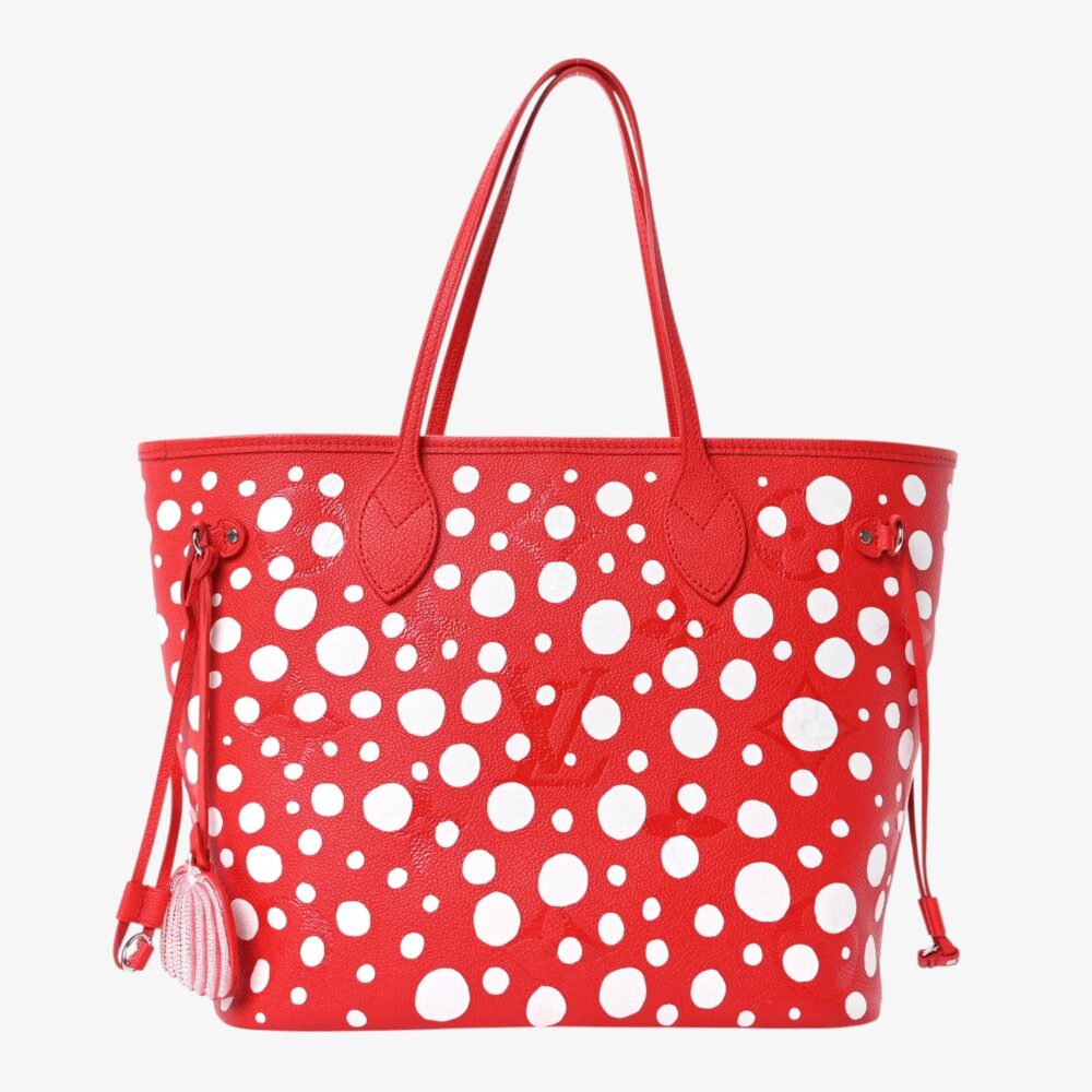 Louis Vuitton LV x YK Neverfull MM in Empreinte Infinity Dots leather with rouge and white accents. A stylish and spacious luxury tote for everyday elegance.