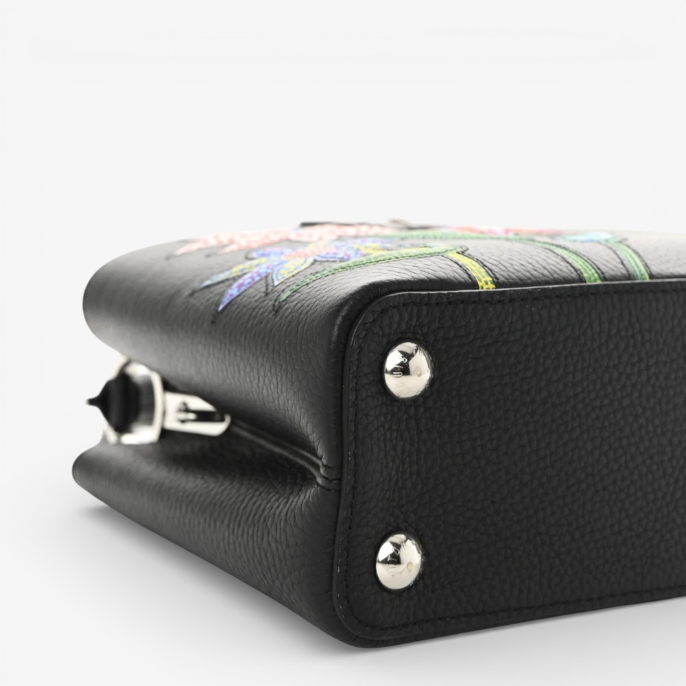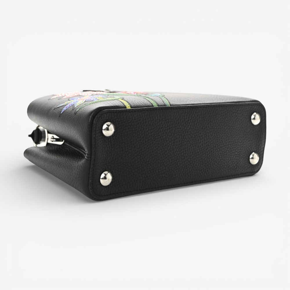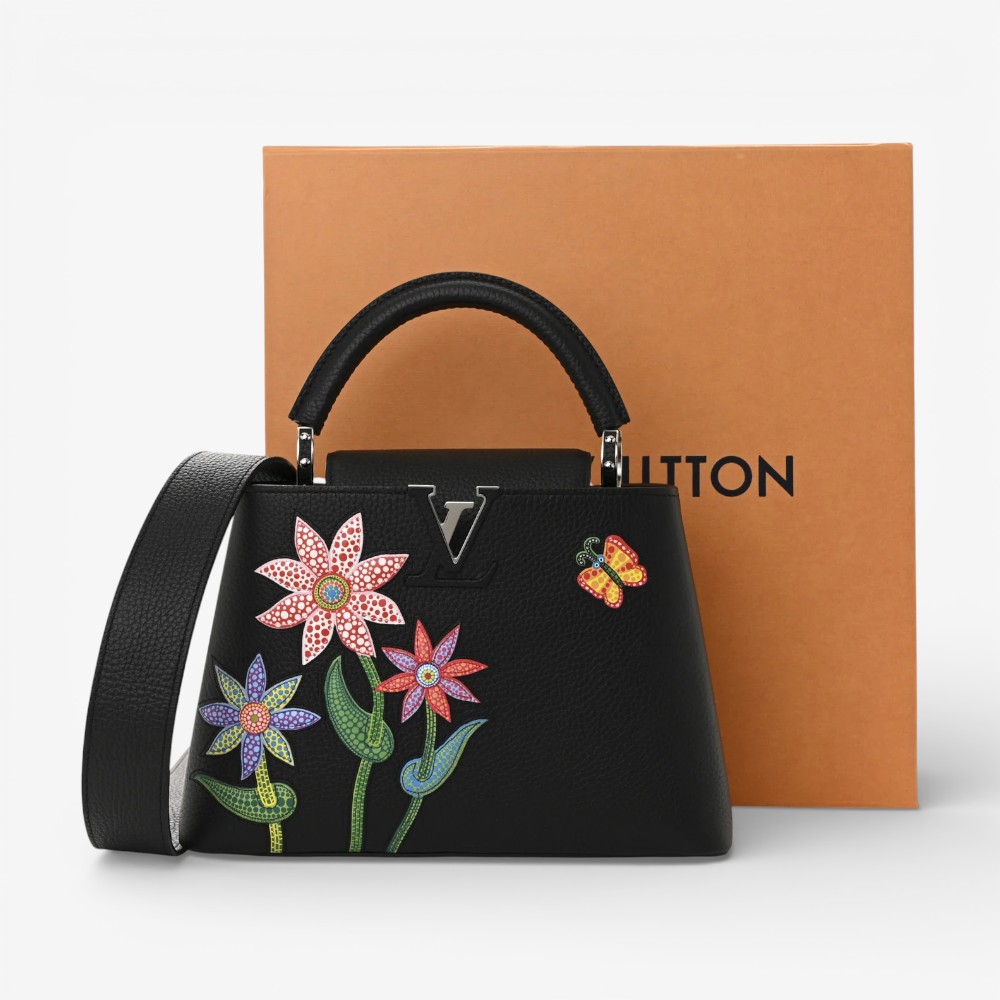 The Louis Vuitton LV x YK Taurillon Inlaid Kusama Flowers Capucines BB Black features premium Taurillon leather with artistic inlaid Kusama floral motifs for standout luxury appeal. Designed with the signature Capucines BB silhouette, elegant top handle, and polished hardware for timeless elegance. This luxury designer handbag offers a compact interior ideal for daily essentials with refined style. A stylish Louis Vuitton mini bag perfect for everyday wear or refined occasions.