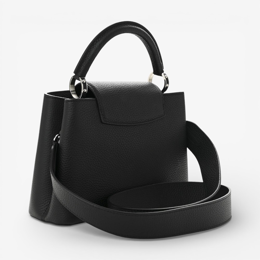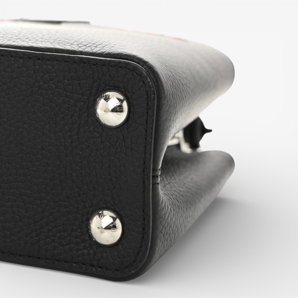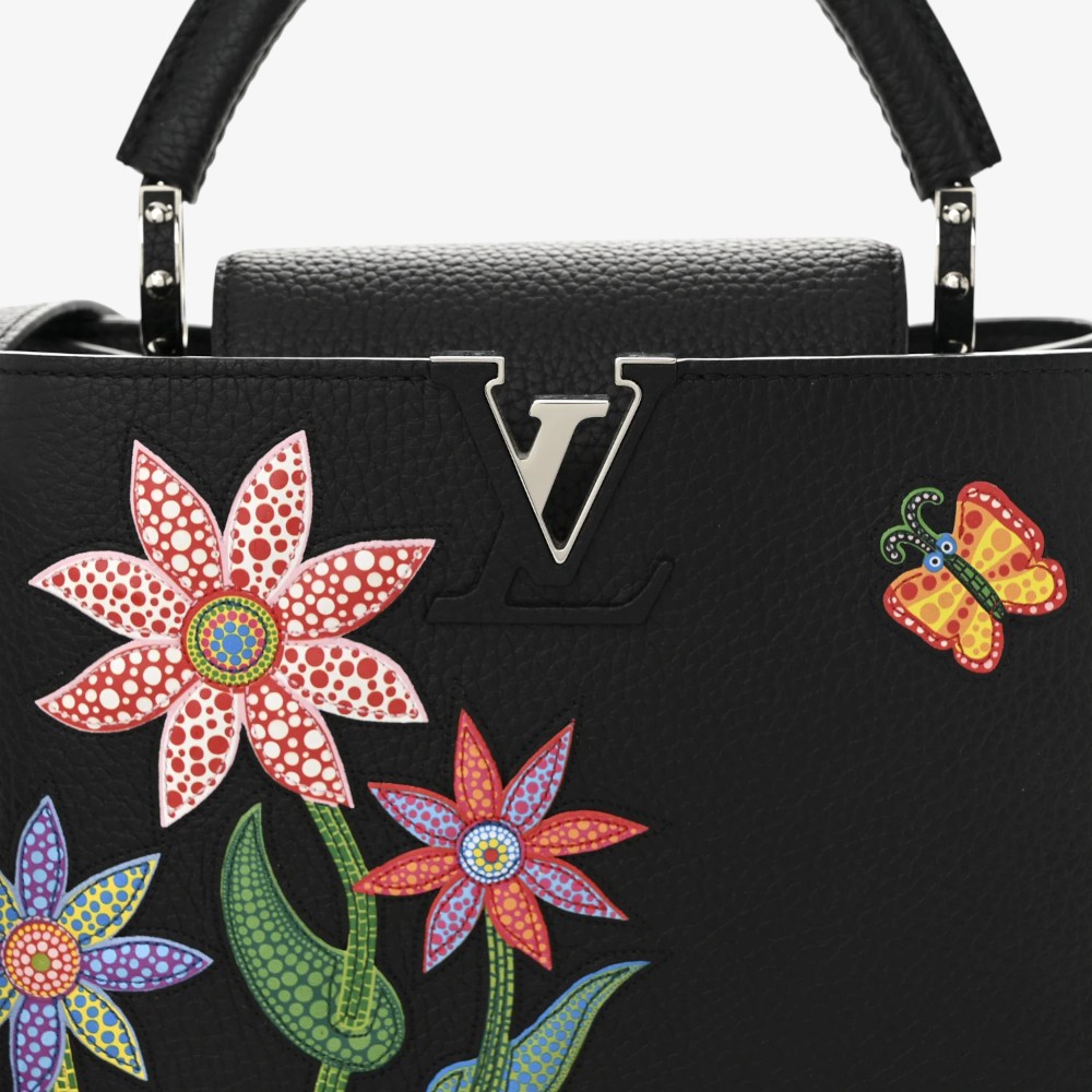 Louis Vuitton Capucines BB in black Taurillon leather with LV x YK inlaid Kusama flower details. A chic luxury handbag perfect for everyday sophistication.