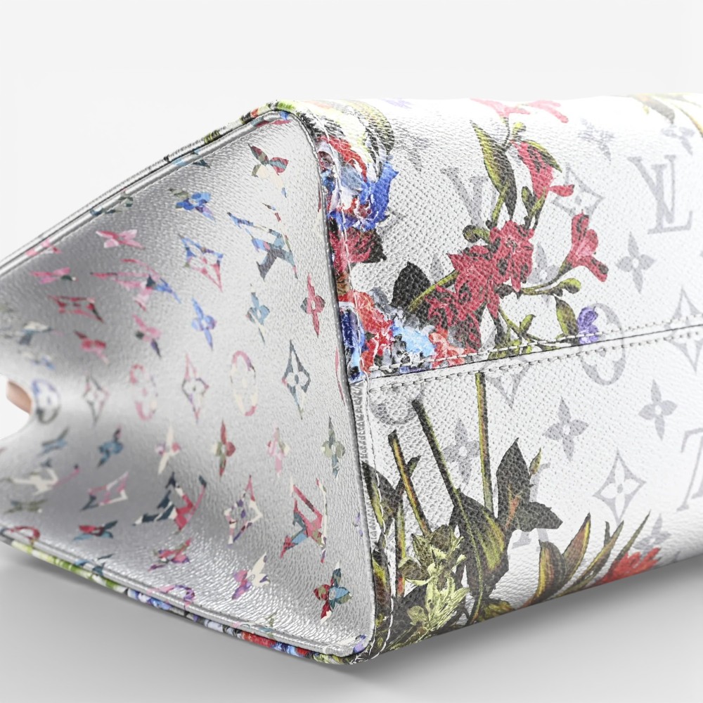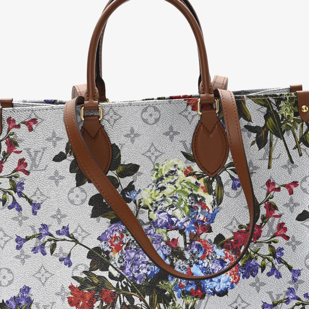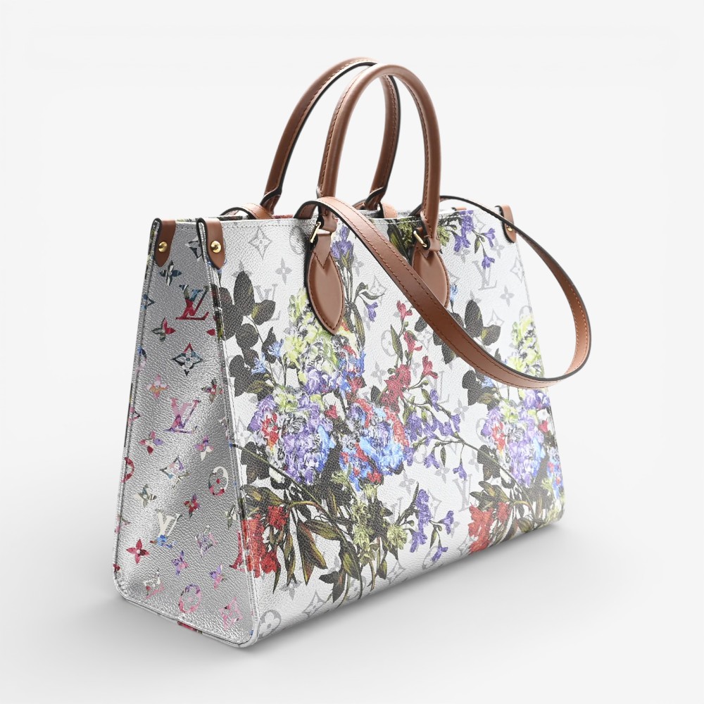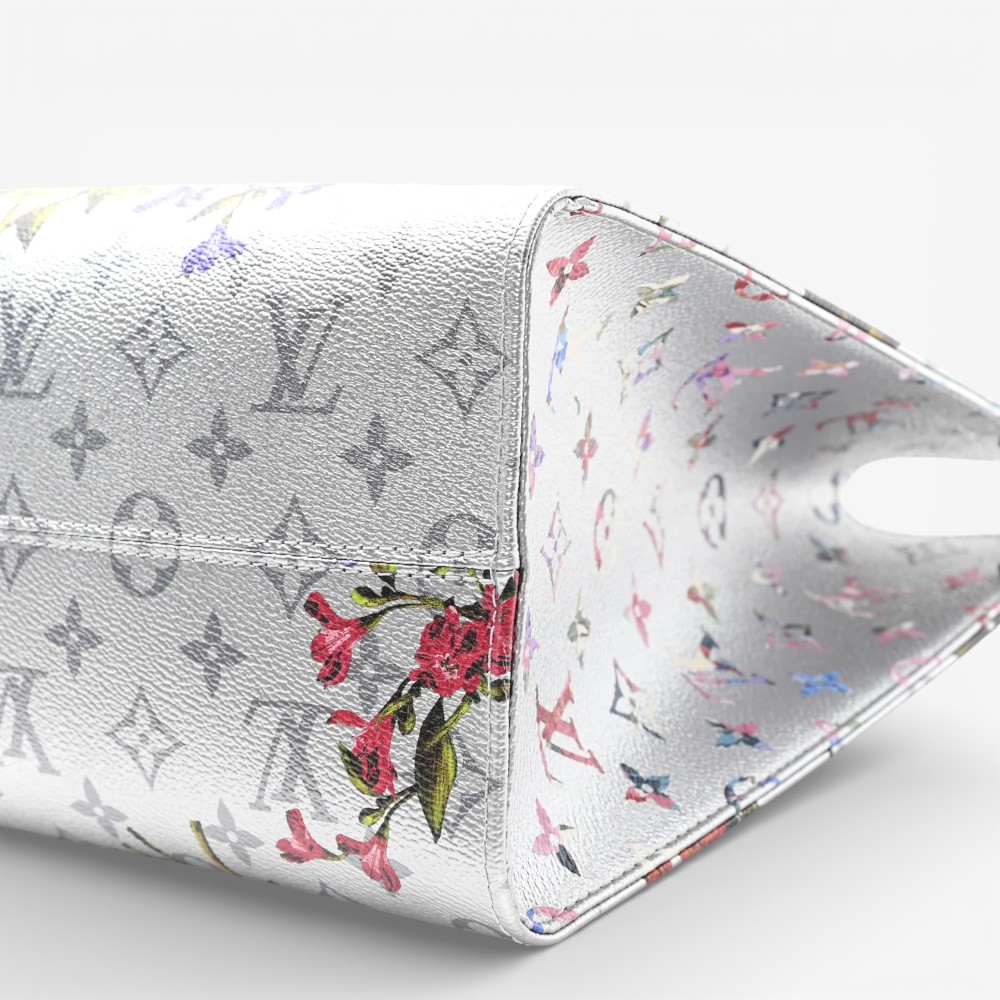Louis Vuitton Onthego MM in metallic Monogram LV Garden canvas with silver accents. A spacious luxury tote bag perfect for stylish everyday elegance.
