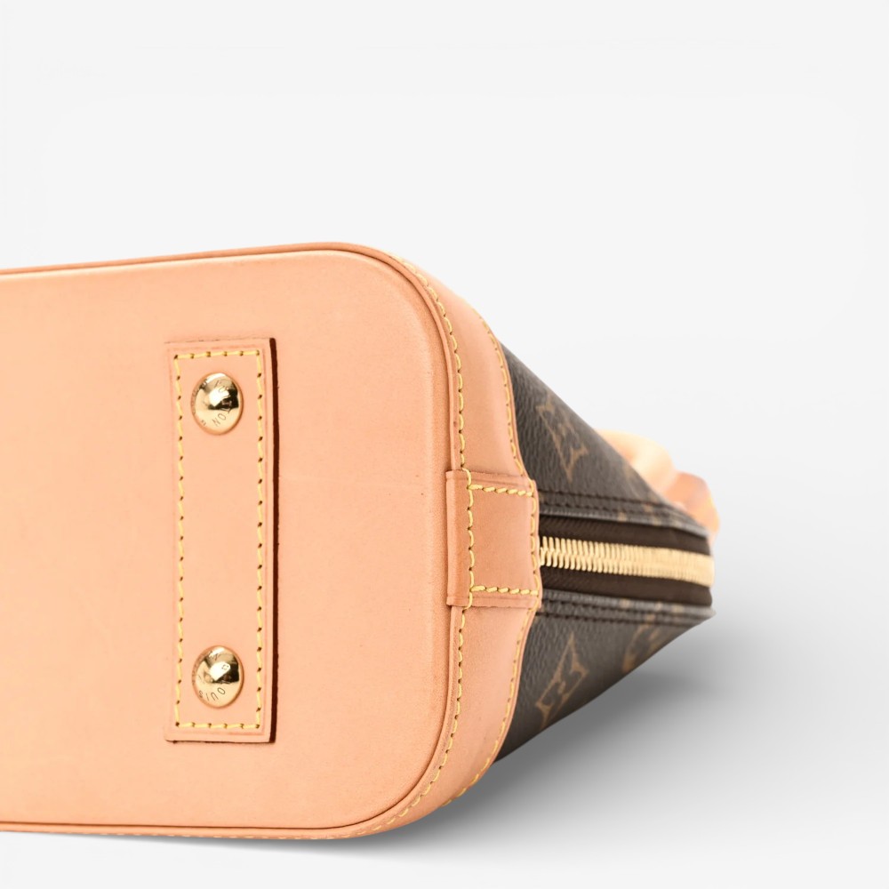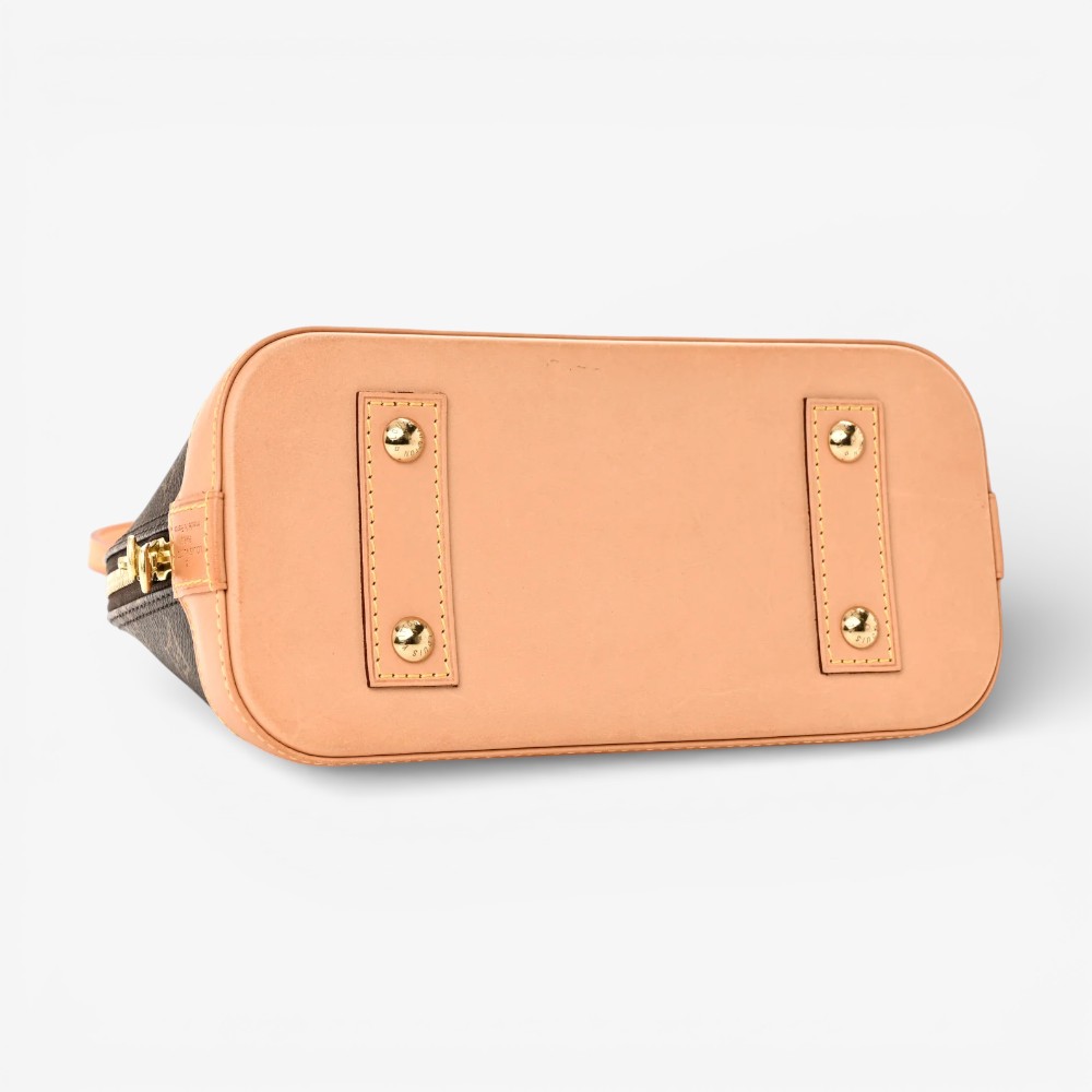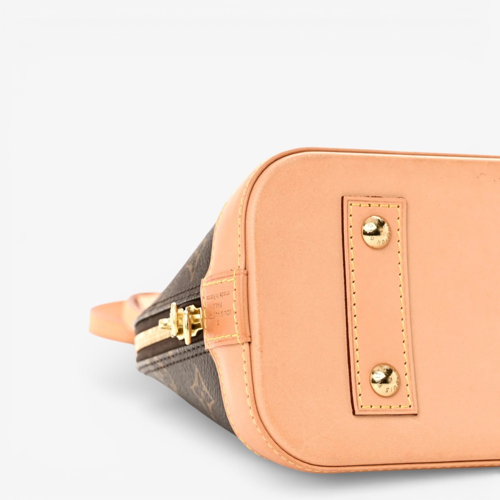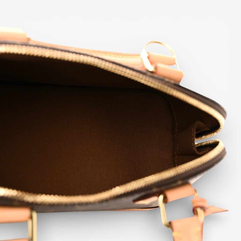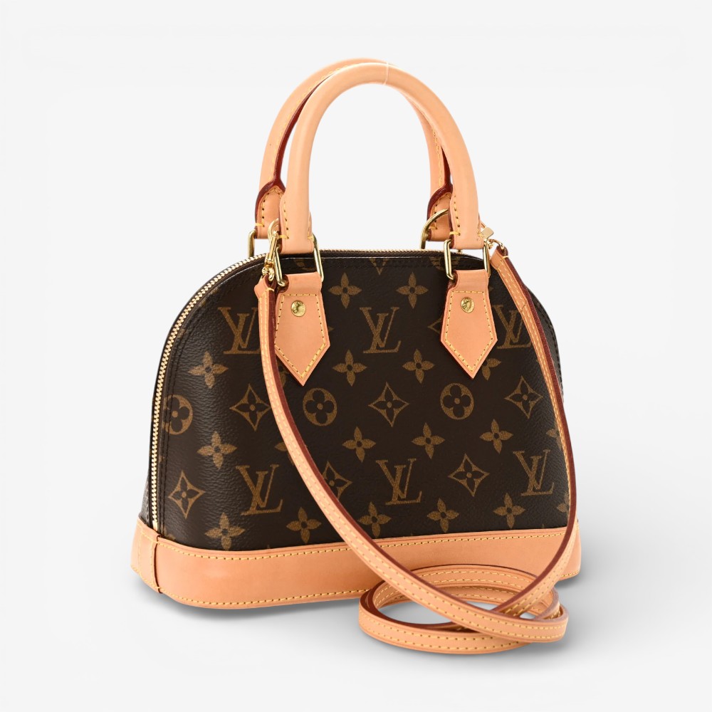 Louis Vuitton Alma BB in classic Monogram canvas with refined leather trim and polished hardware. A chic luxury mini handbag perfect for everyday elegance.