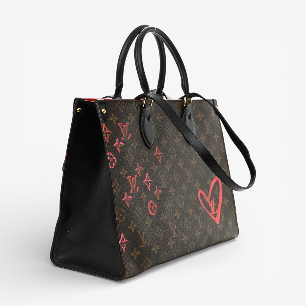 Louis Vuitton Onthego MM in Monogram “Fall in Love” canvas with seasonal graphic accents. A spacious luxury tote bag perfect for elevated everyday wear.