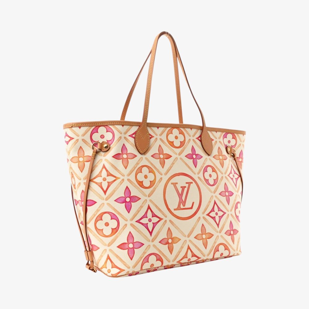 Vibrant Louis Vuitton Neverfull MM in Monogram Giant By The Pool 20 canvas with coral accents. A spacious luxury tote perfect for stand-out everyday style.
