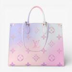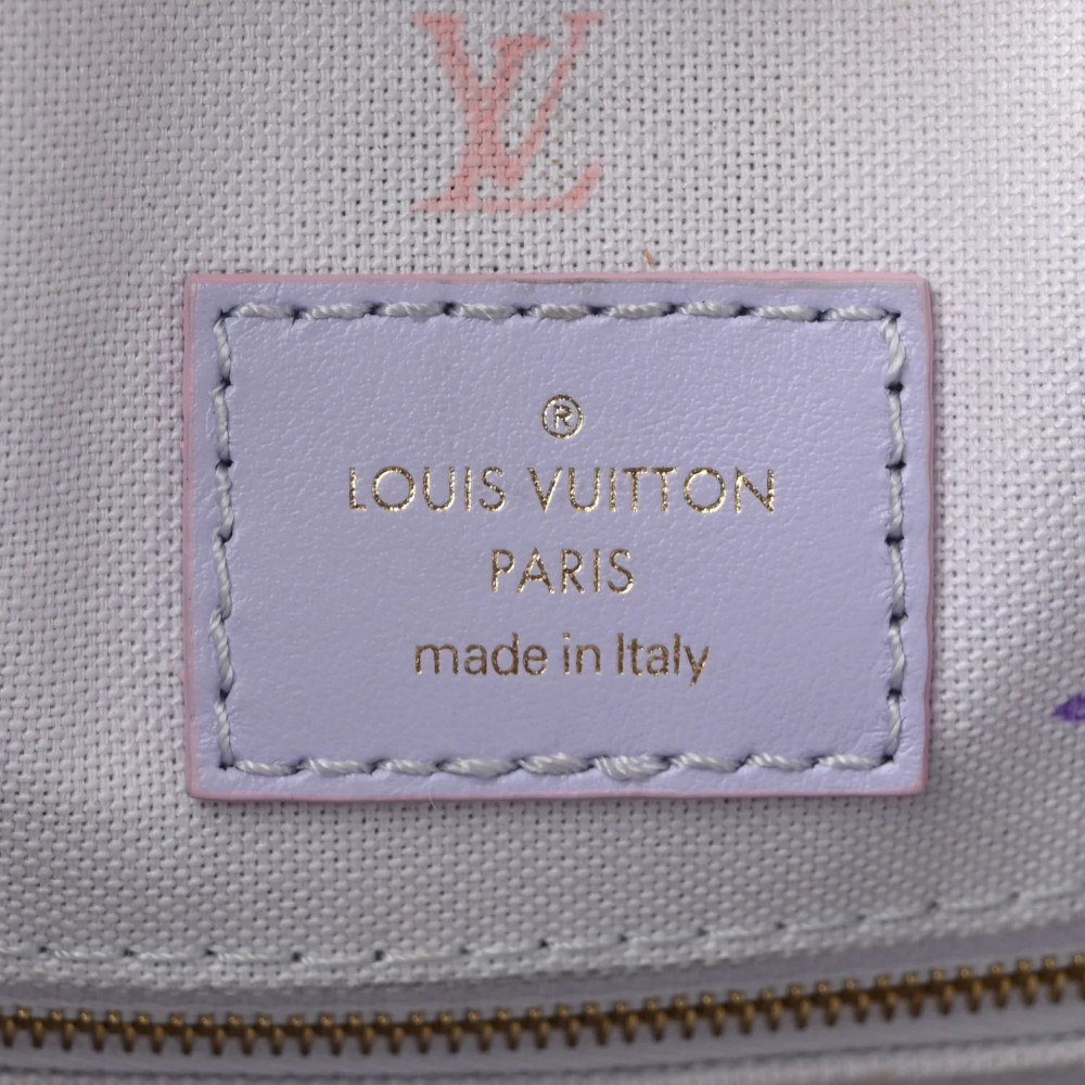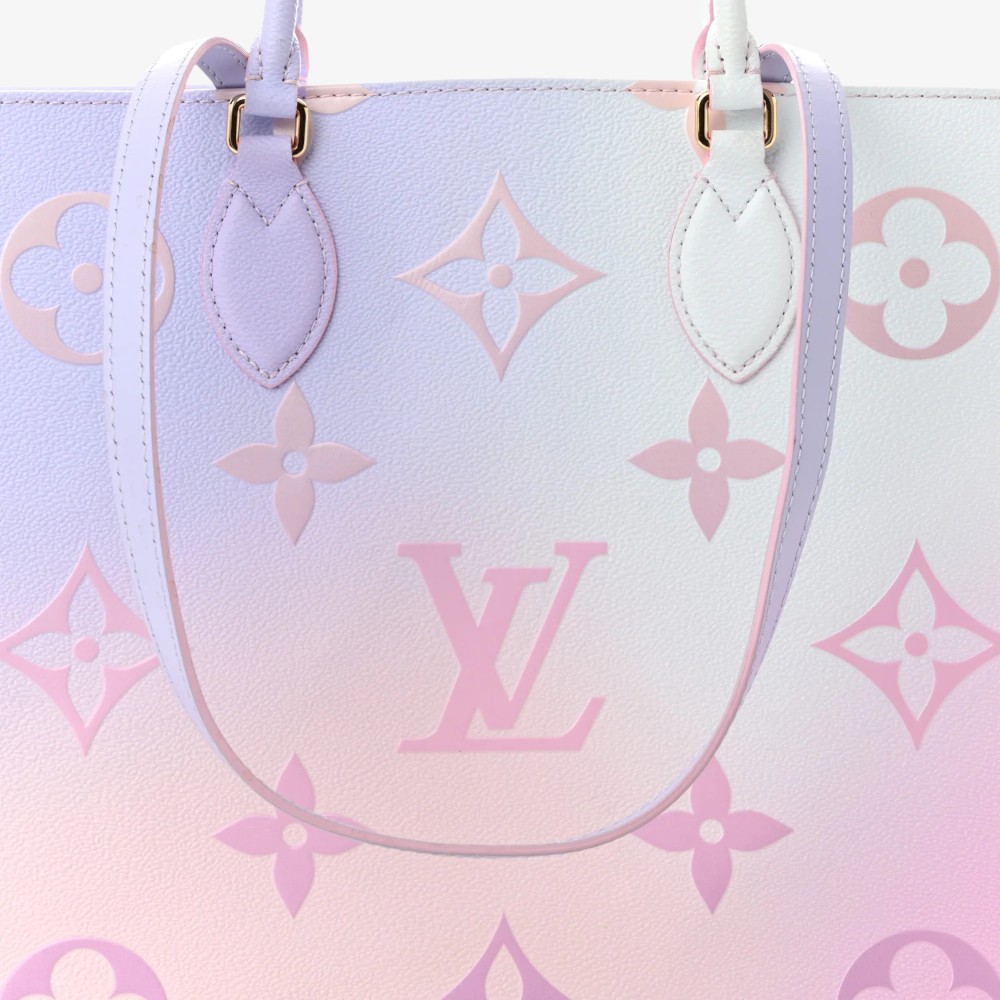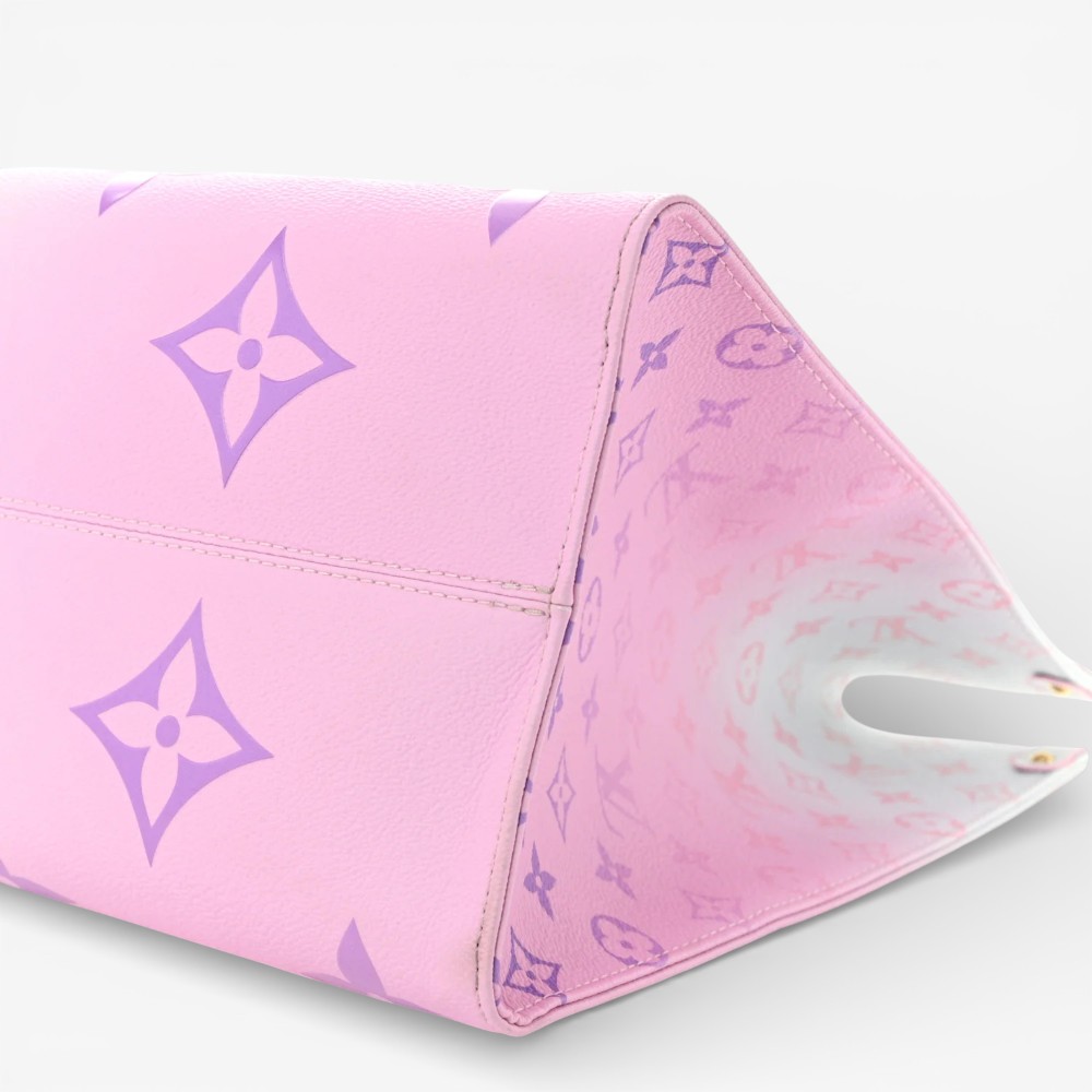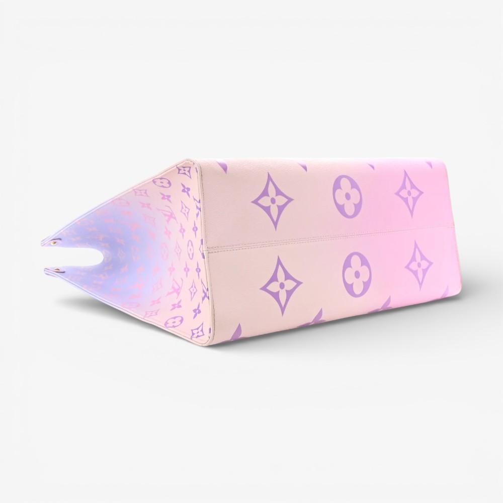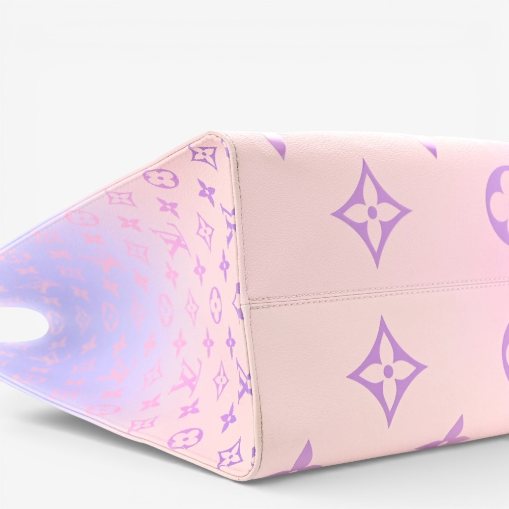 The Louis Vuitton Monogram Giant Spring in the City Onthego GM Sunrise Pastel features bold Monogram Giant canvas with seasonal sunrise pastel graphics for standout luxury style. Designed with leather top handles and long shoulder straps for versatile, comfortable carry options. This luxury designer tote bag offers a roomy interior ideal for daily essentials with polished sophistication. A chic Louis Vuitton tote bag perfect for everyday use or elevated casual outfits.