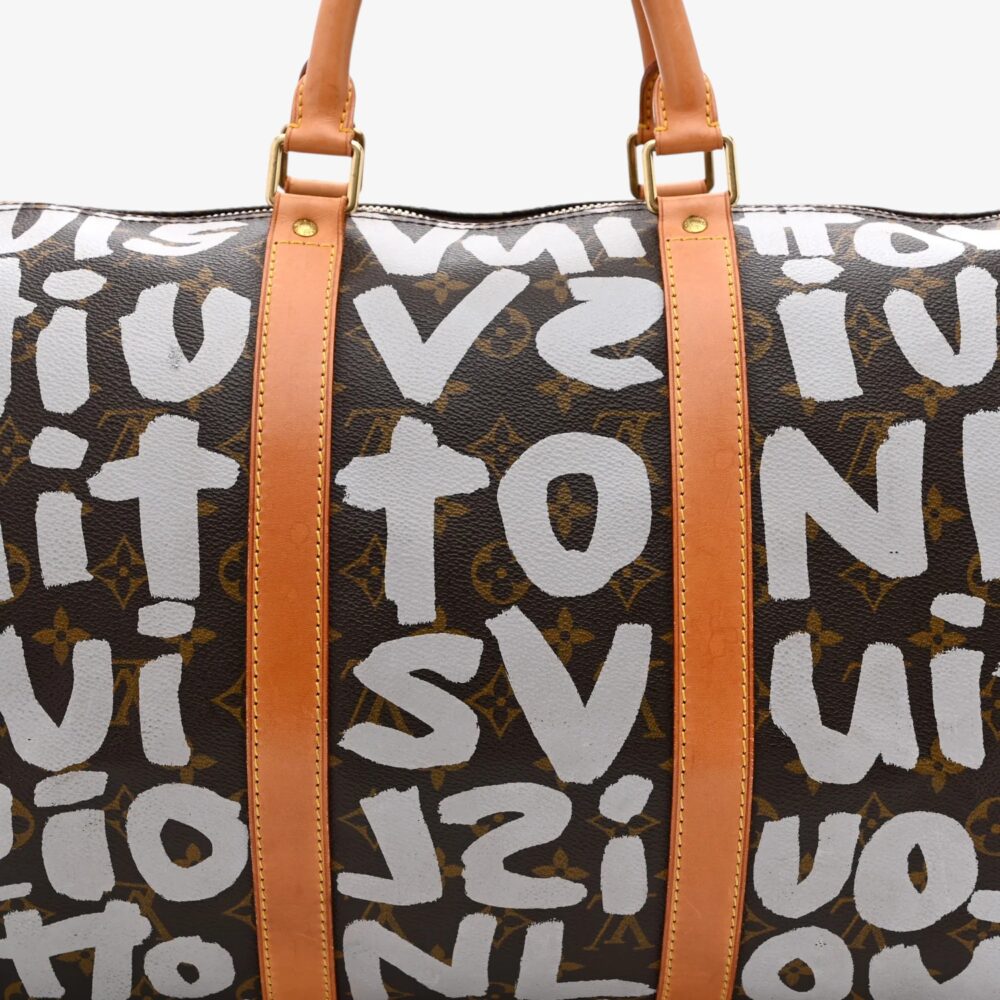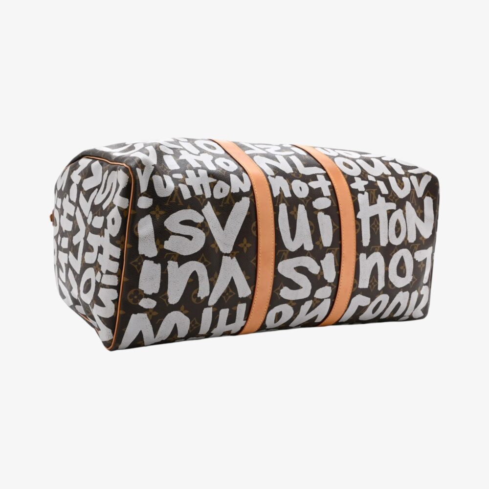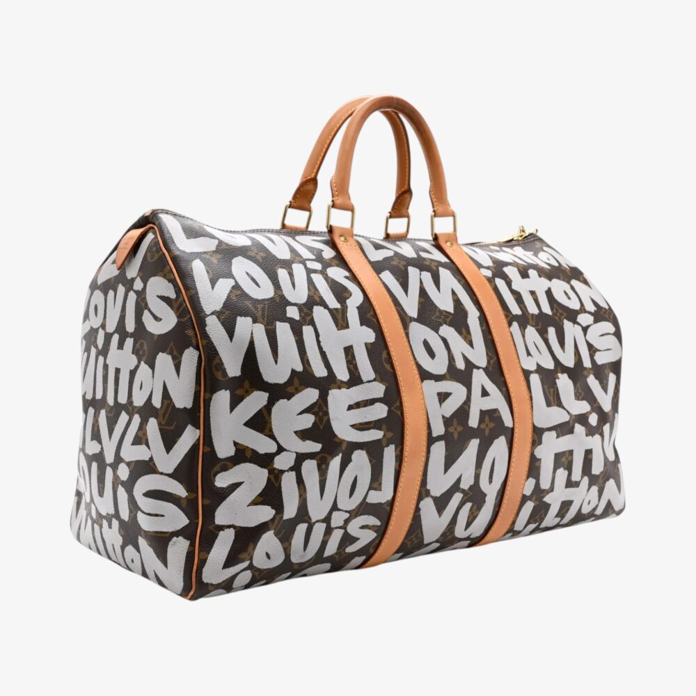 Artistic Louis Vuitton Keepall 50 in Monogram Graffiti canvas with silver accents. A luxury travel bag blending bold design with everyday functionality.