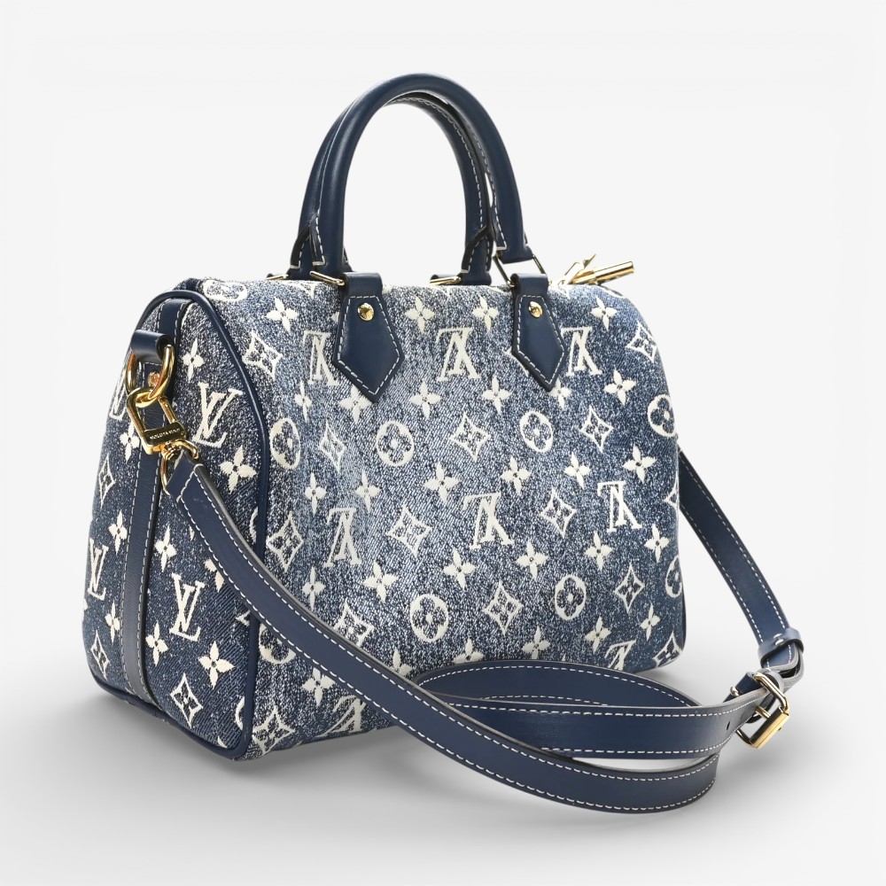 Louis Vuitton Speedy Bandoulière 25 in Monogram Jacquard denim with blue accents and refined leather trim. A chic luxury handbag perfect for everyday elegance.