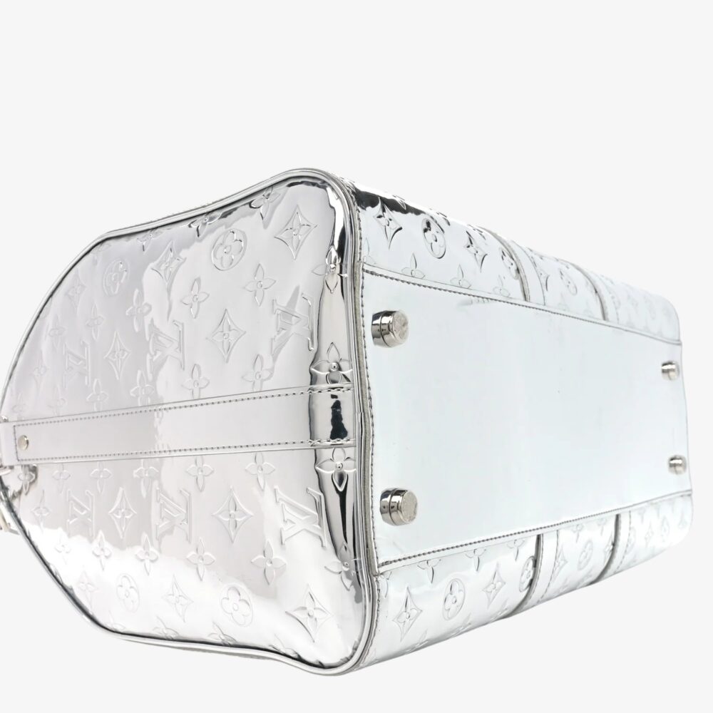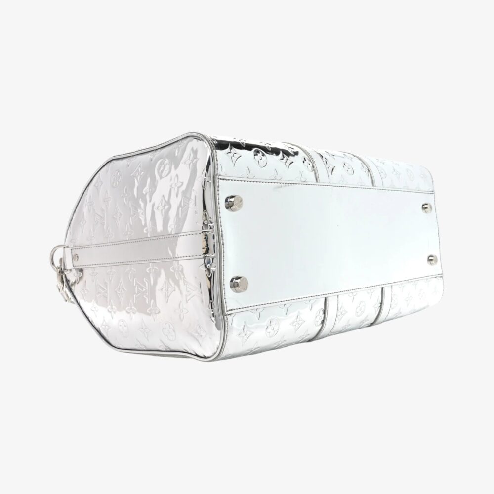 Shiny Louis Vuitton Keepall 45 in Monogram Mirror canvas with sleek silver tones. A luxury travel bag crafted for standout style and everyday practicality.