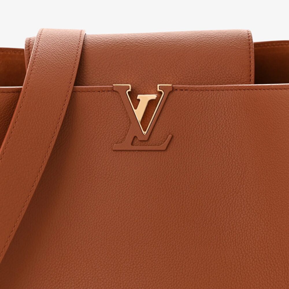 The Louis Vuitton Smooth Grained Calfskin Capucines GM Souple features premium grained calfskin leather for a refined and supple look. Designed with the signature Capucines silhouette, elegant top handle, and subtle hardware for timeless appeal. This luxury designer handbag offers a roomy interior ideal for daily essentials with elevated style. A chic Louis Vuitton tote bag perfect for daily wear or refined occasions.