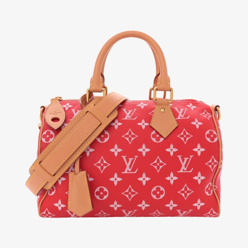 Elegant Louis Vuitton Speedy Bandoulière 25 in red soft calfskin Monogram leather. A luxury handbag that blends classic style with everyday practicality.