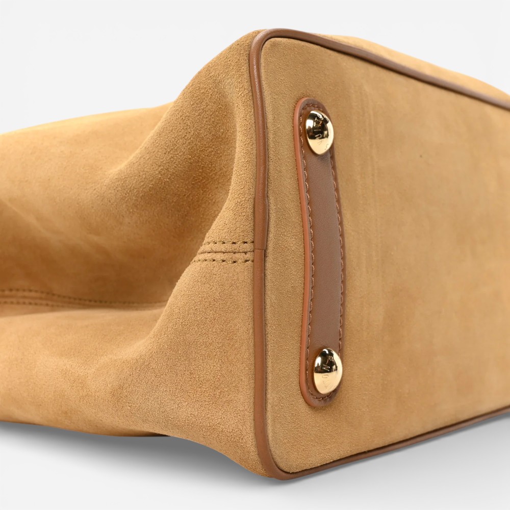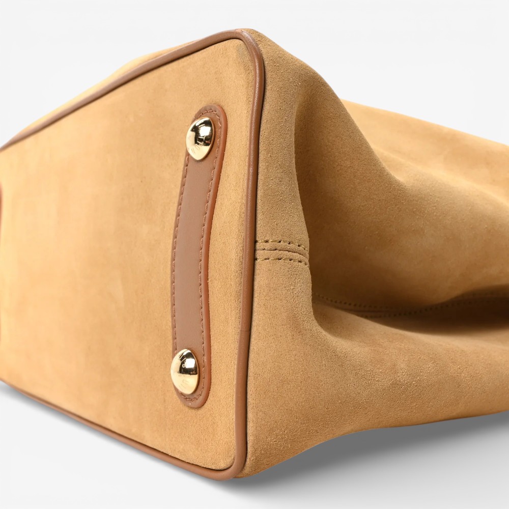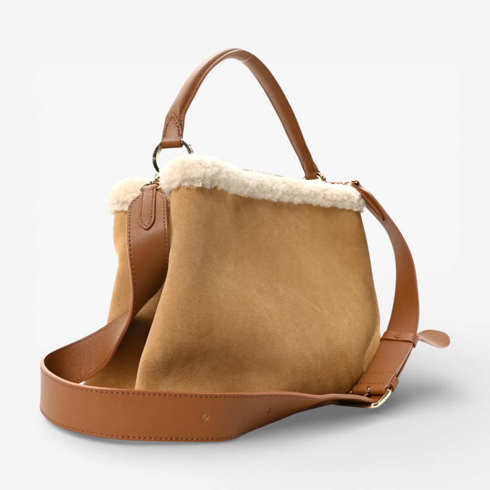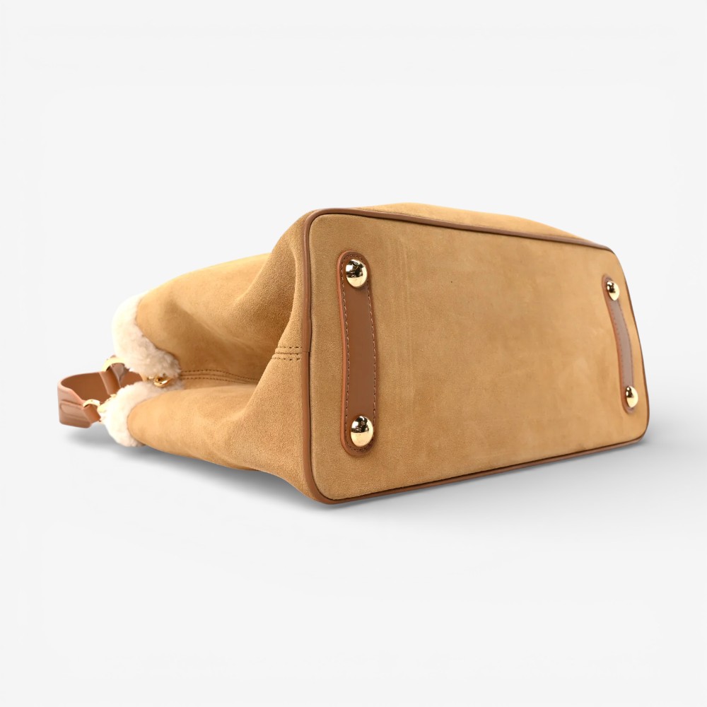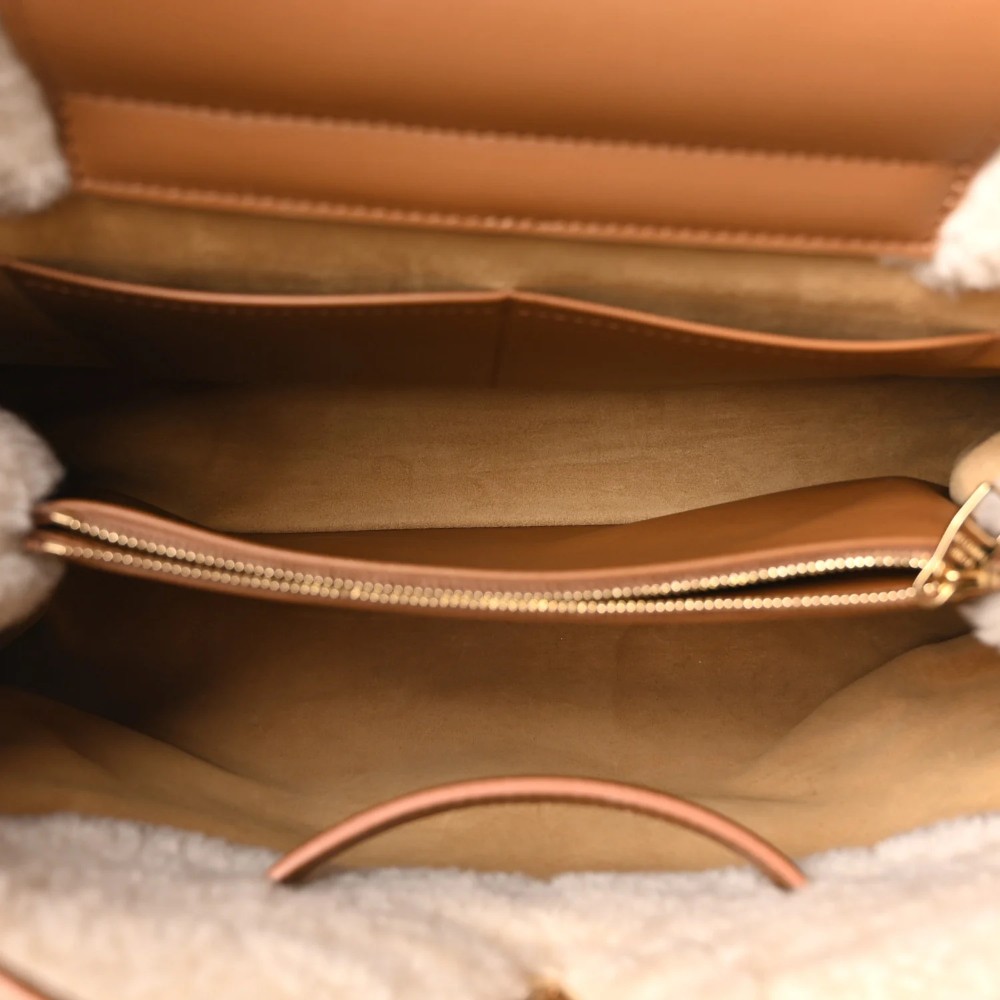 Louis Vuitton Capucines GM Souple in beige suede calfskin with shearling trim and refined detailing. A luxurious handbag perfect for everyday elegance and cozy style.