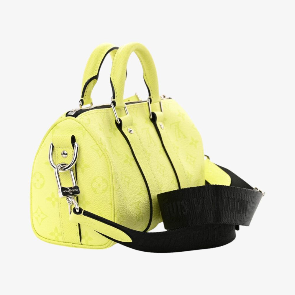 Bright Louis Vuitton Keepall 25 in Taigarama leather with lemon yellow accents. A luxury compact travel bag perfect for carrying essentials with bold style.