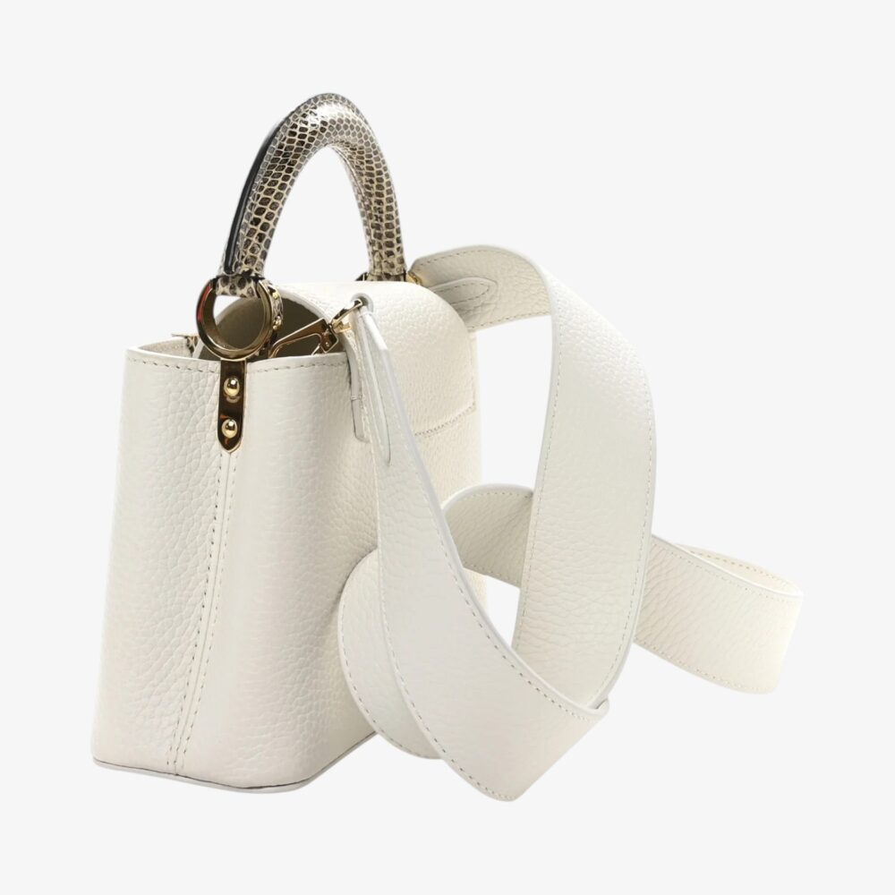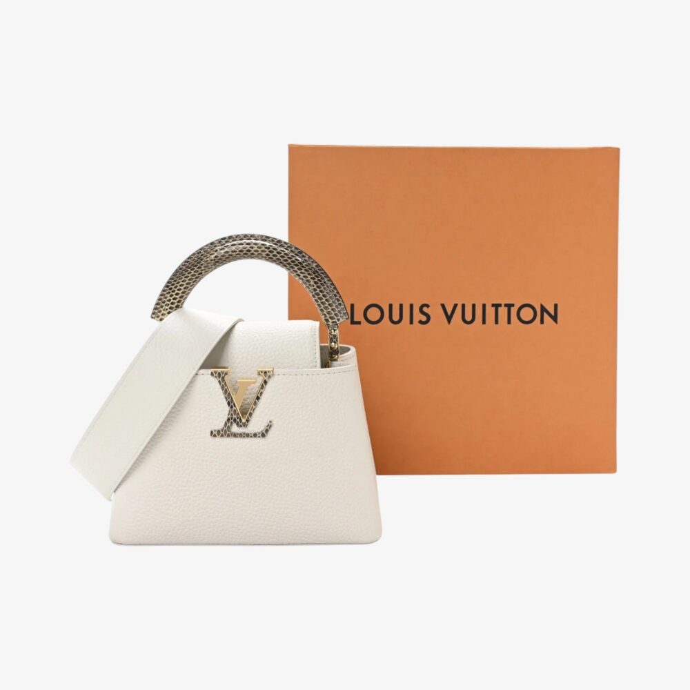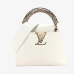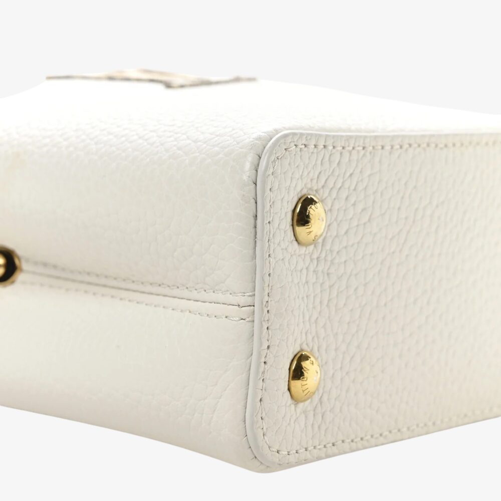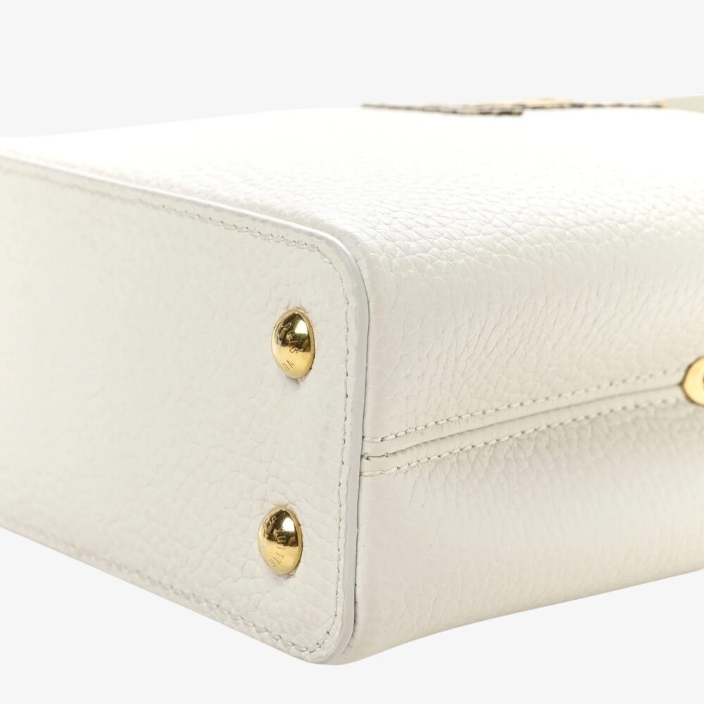 Elegant Louis Vuitton Capucines Mini in Taurillon leather with Ayers texture and crisp white finish. A luxury handbag with refined style and everyday versatility.