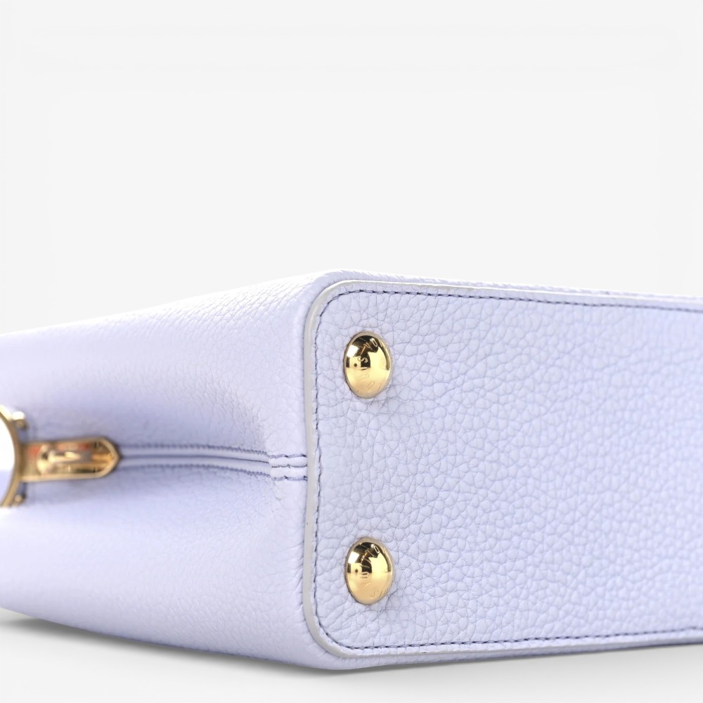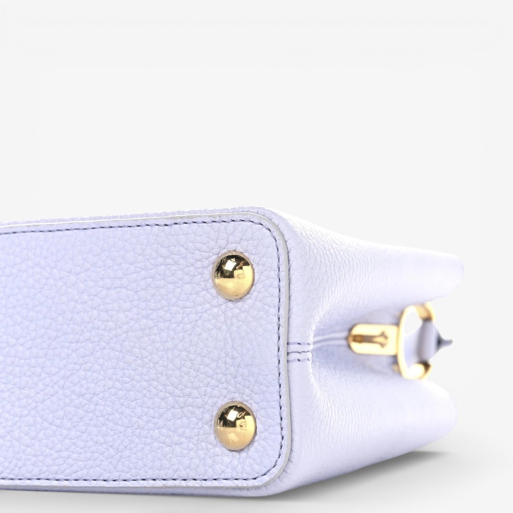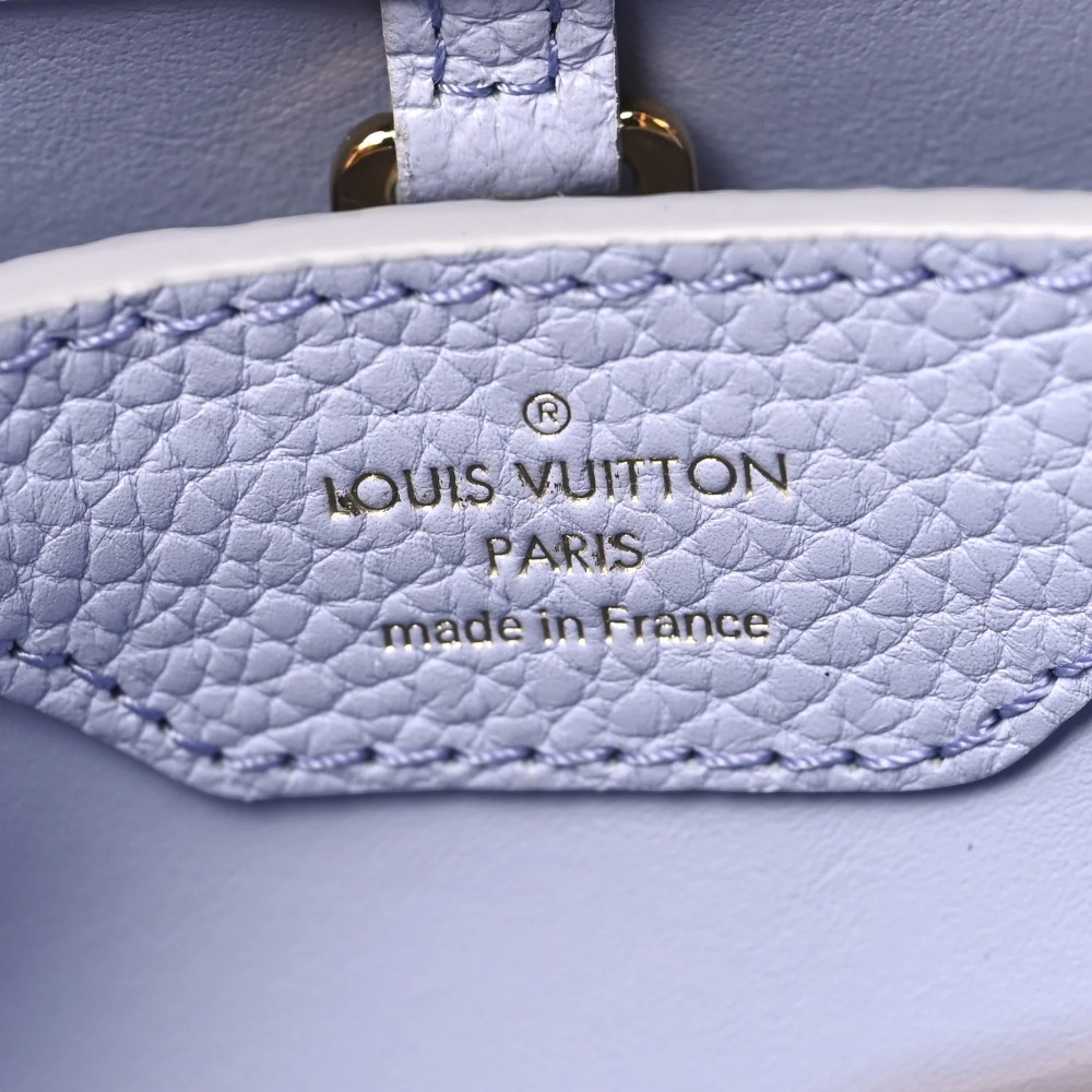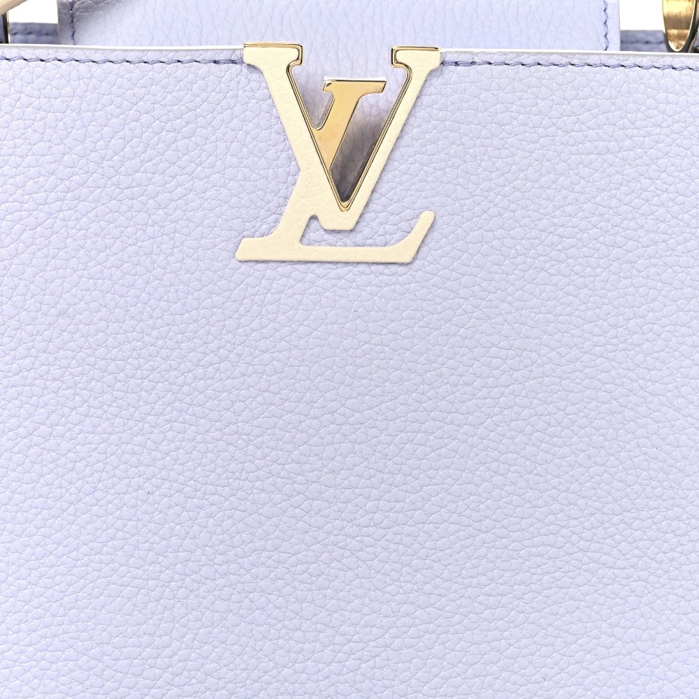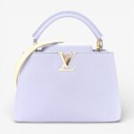 Louis Vuitton Capucines BB in iris crème Taurillon leather with braided chain detail. A chic luxury handbag perfect for stylish everyday elegance.