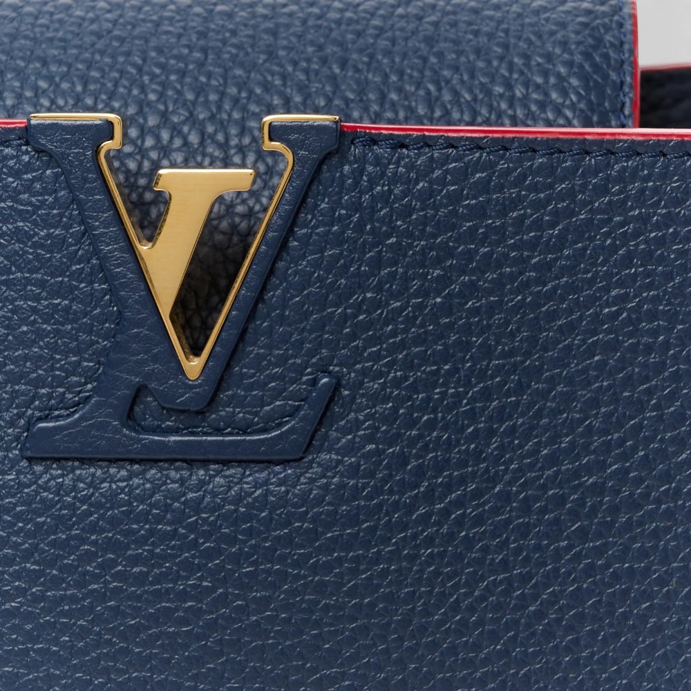 The Louis Vuitton Taurillon Capucines BB Marine Rouge features premium Taurillon leather with striking marine and rouge tones for standout luxury style. Designed with the signature Capucines BB silhouette, elegant top handle, and polished hardware for timeless sophistication. This luxury designer handbag offers a compact interior ideal for daily essentials with refined appeal. A stylish Louis Vuitton mini bag perfect for everyday use or elevated occasions.