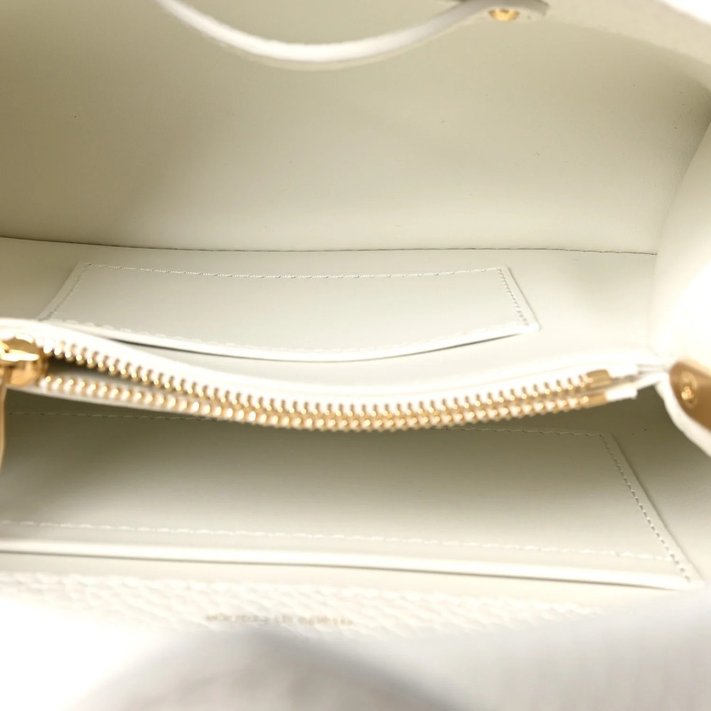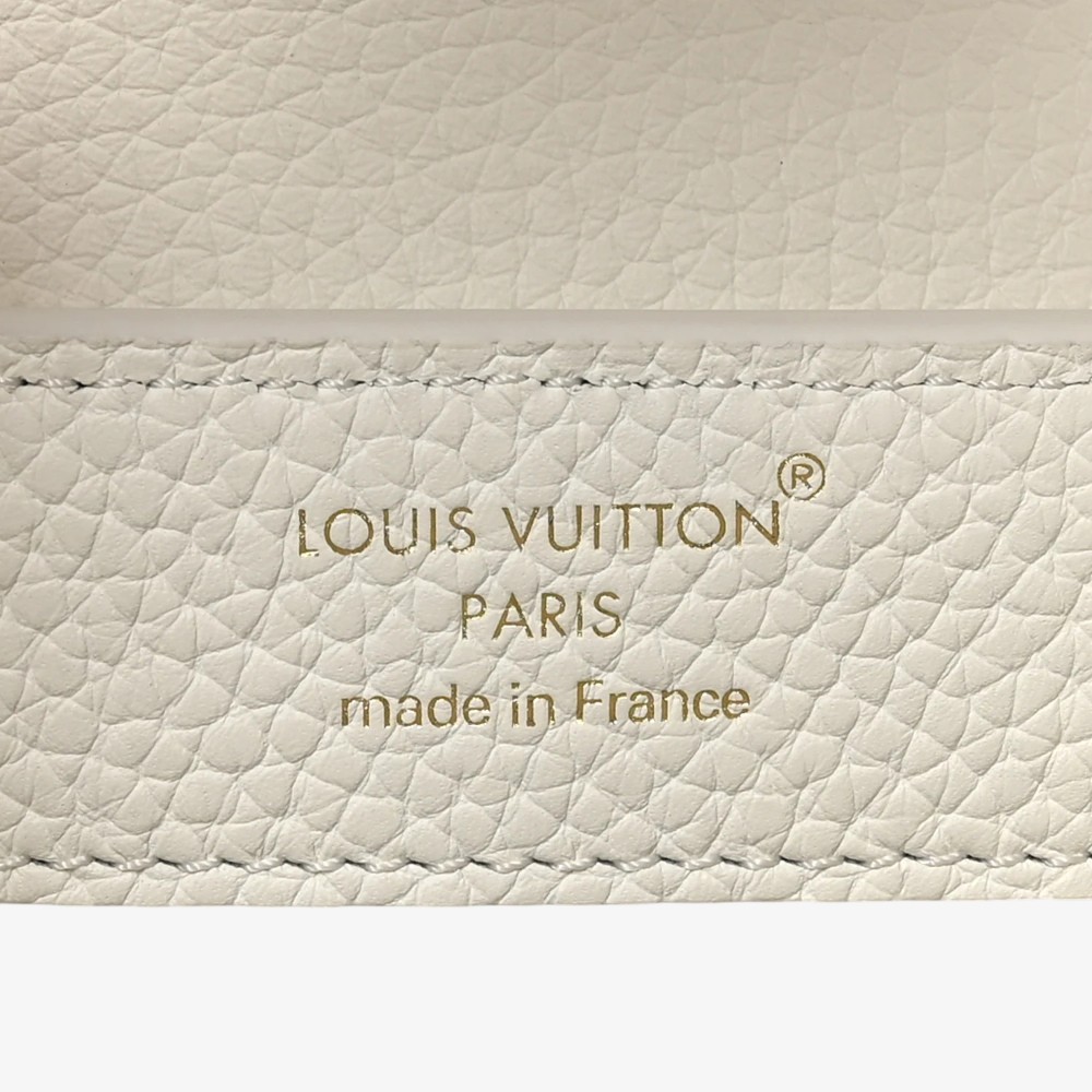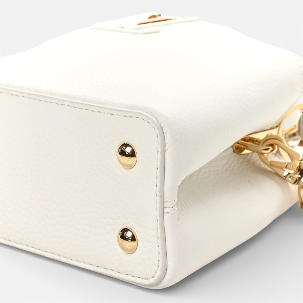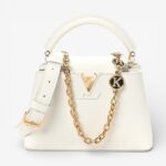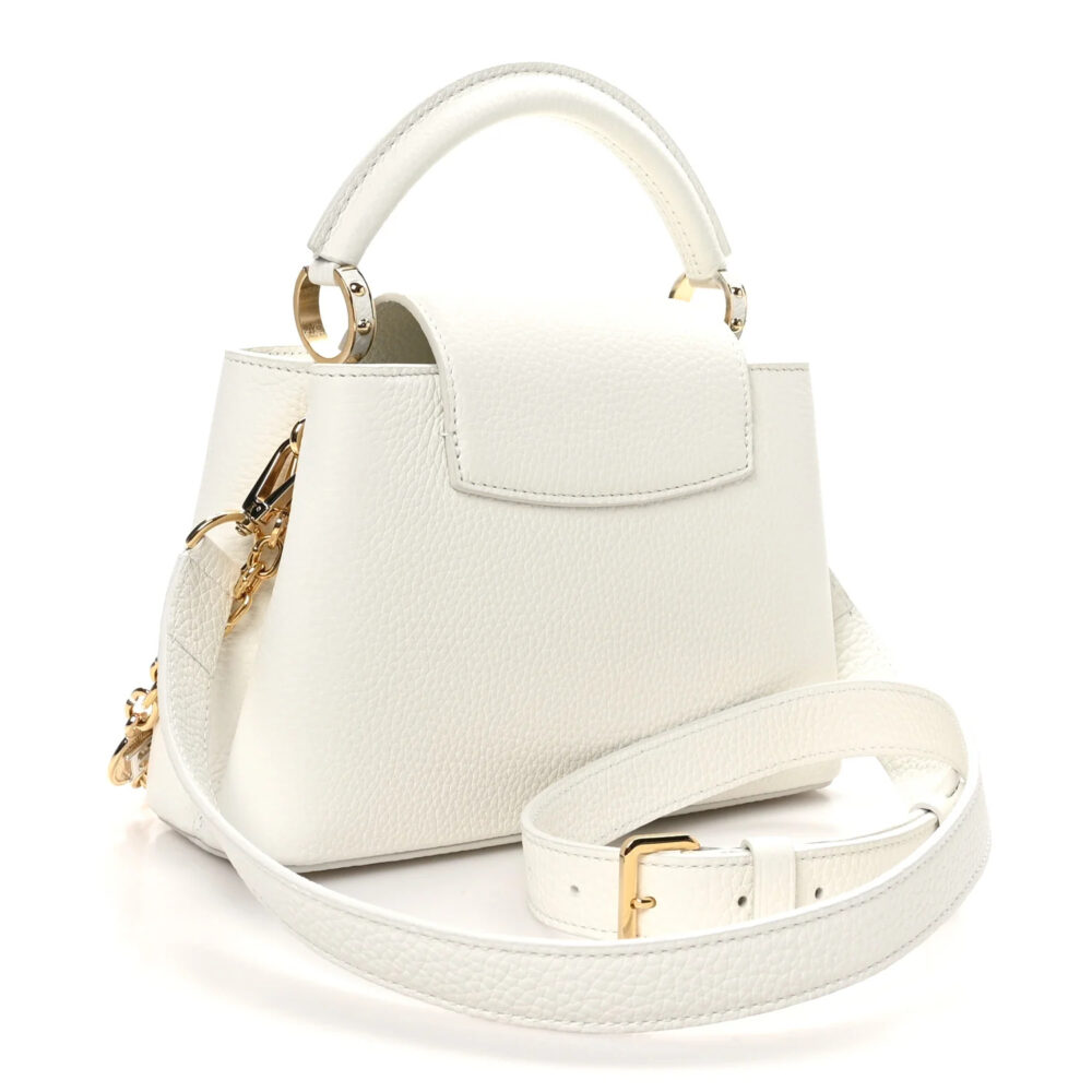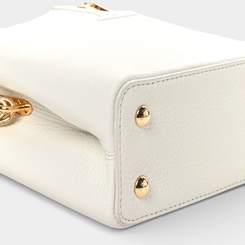 Louis Vuitton Capucines Small Chain in snow white Taurillon leather with elegant hardware. A chic luxury handbag perfect for everyday elegance.
