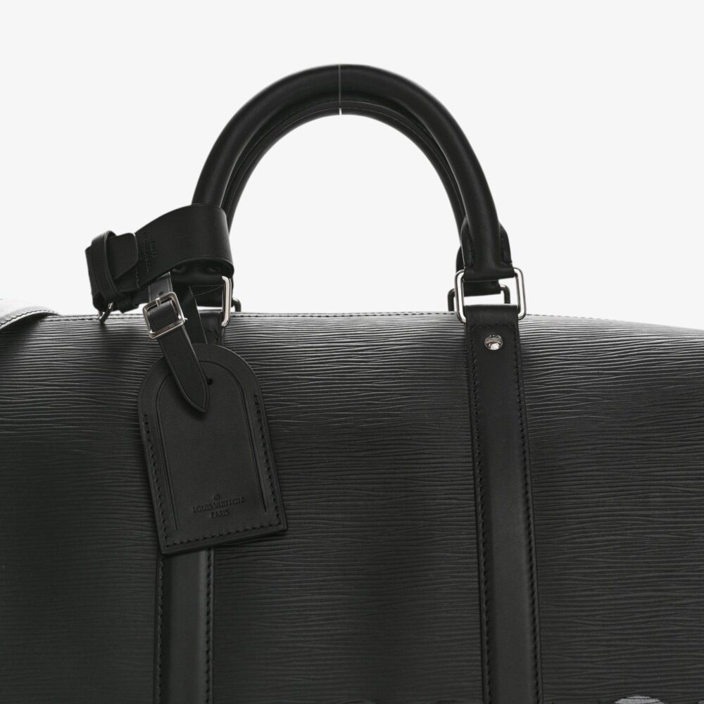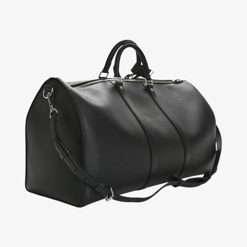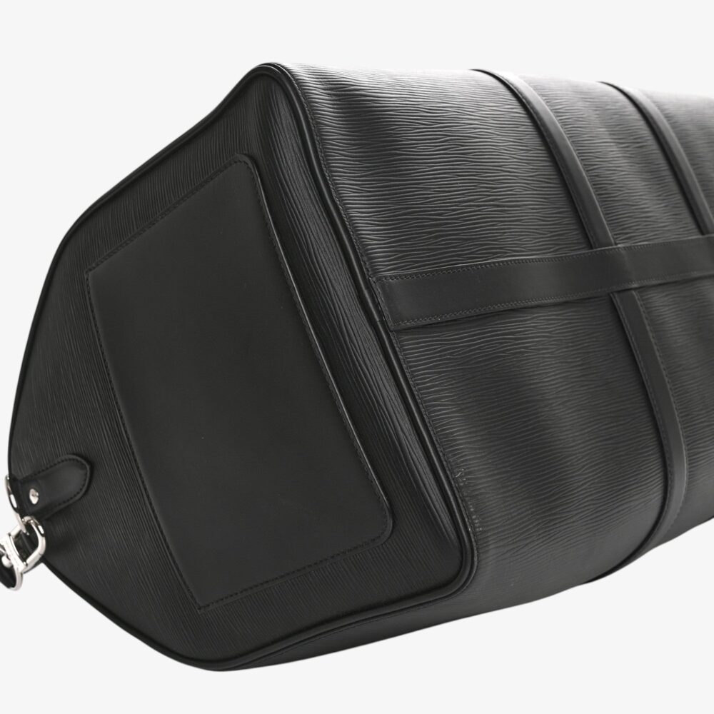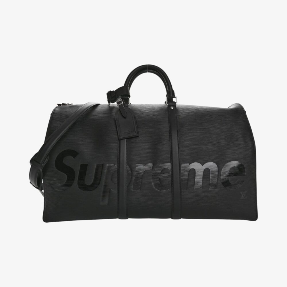 Iconic Louis Vuitton x Supreme Keepall 55 in black Epi leather with bold collaboration details. A luxury travel bag designed for standout style and practical use.